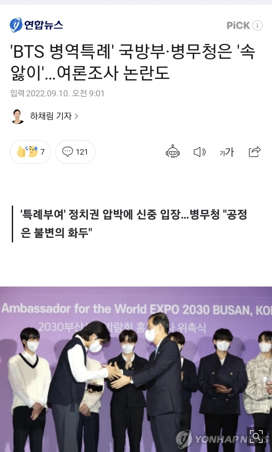 이 와중에 정치권에서 BTS의 병역 특례 논란에 불을 붙였다. 지난 정부의 문체부 장관은 BTS의 입대는 국가적 손실이라며 "20대 청년들, 양해해 달라"고 말했으며, 이번 정부에서도 국방부가 여론조사를 실시하느니 하며 명확한 답을 내지 못하고 있다.