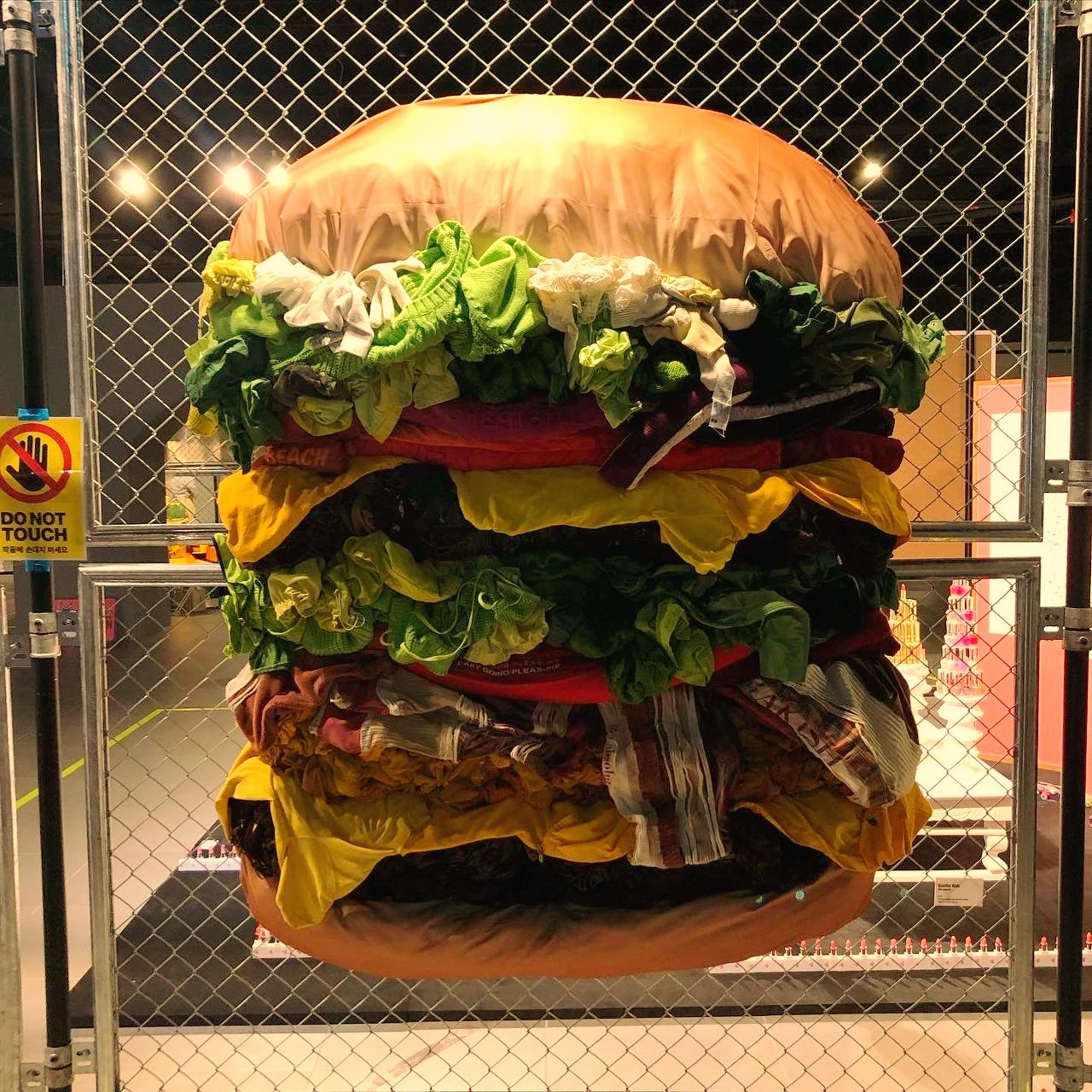 지난주 Korean eye 2020 전시를 다녀왔는데 옷으로 만든 햄버거가 유독 눈길을 끌었다. 'Bon appetit'는 프랑스어로 '맛있게 드세요'라는 말인데 이 문구가 나에게는 공포로 다가오는 듯했다. 무심코 버린 옷들이 결국 우리의 식탁에 올라오게 되는 것은 아닐까? 하는 생각 때문이었다.
