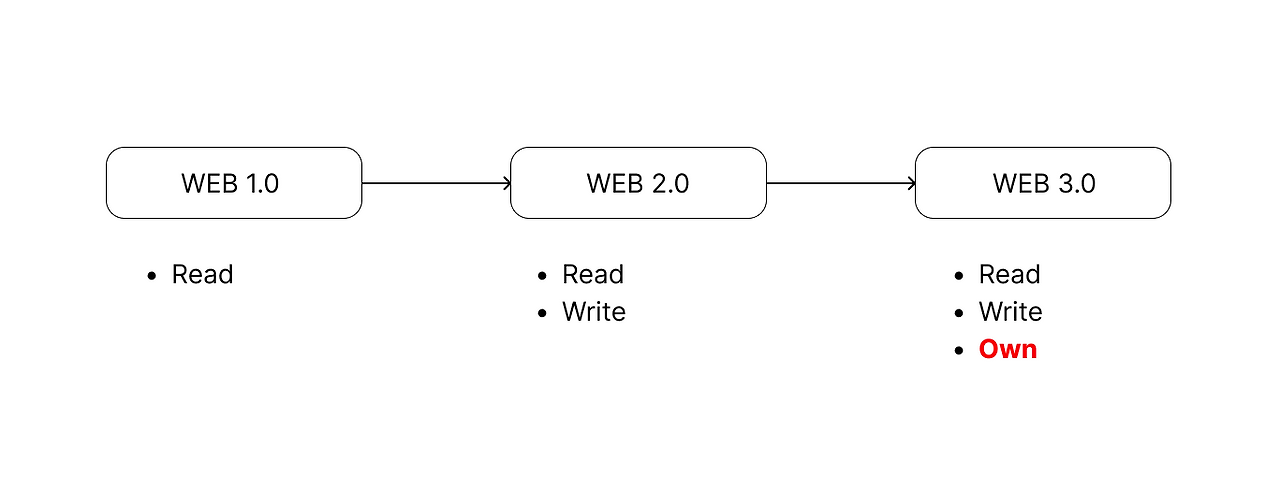 오늘 할 이야기는 Web 2.5에 대한 내용이지만 혹여 Web 2.0(이하 'Web2'), Web 3.0(이하 'Web3')에 대한 용어를 모르는 사람분들을 위해 간단히 설명하자면 아래와 같다. Web 1.0에서는 읽기만 가능했고, Web2에서는 읽고, 쓰기가 가능해졌다. 그리고 앞으로 다가올 인터넷 세상인 Web3는 읽고, 쓰고, 소유한다는 개념이다.