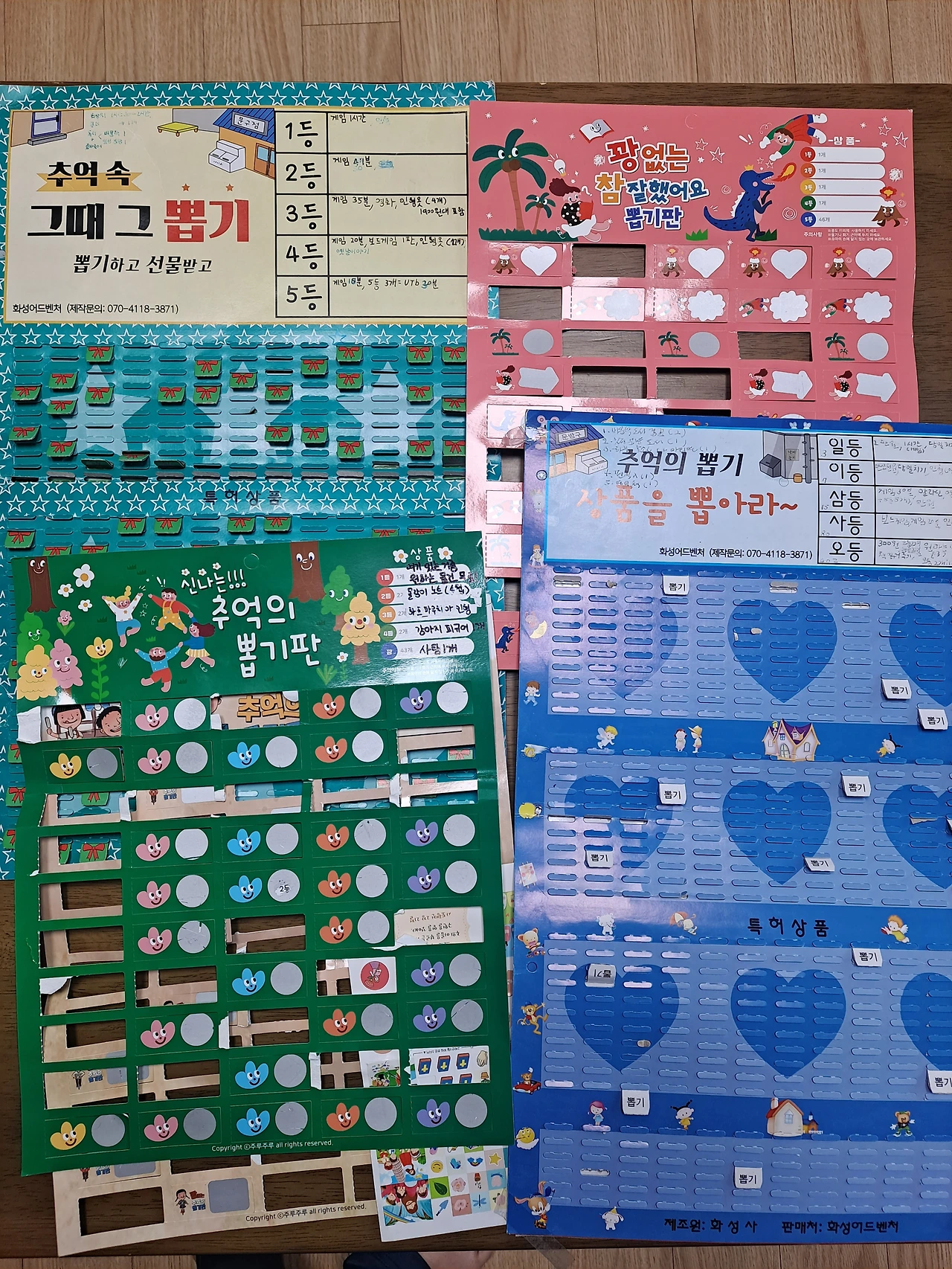 결과적으로 엄마표영어를 하게 된 셈인데 요즘처럼 다양한 콘텐츠들이 쏟아져 나오는 시대에는 엄마가 영어를 몰라도 전혀 문제가 되지 않는다는 것을 몸소 체험하고 있다. 글자를 찍으면 원어민이 읽어주는 세이펜이라는 신기하고도 편리한 기계가 있으니 발음걱정하며 떨리는 목소리로 어색하게 영어책을 읽어줄 필요가 없다. 레벨에 맞게 차근차근 영어콘텐츠를 볼 수 있는 리틀팍스. 리딩게이트 등등 온라인 영어 도서관이 넘쳐난다. 문제는 콘텐츠가 아니라 그걸 보게 하는 것과 그것이 꾸준히 유지되게 하는 것일 것이다. 그래서 동기부여를 위해 옛날 학교 앞 문방구에서 볼 수 있었던 종이로 된 뽑기 판을 주문해 놓았다. 한 장씩 뽑으면 그 뒤에 1등부터 5등까지 숫자가 쓰여 있는데 5등짜리 1개면 게임 5분, 3개면 좋아하는 TV프로그램 보기, 3등짜리면 다이소에서 원하는 물건 1개 사기, 1등이면 당일치기 놀러 가기, 게임 1시간 등 딸과 함께 약속을 정해놓았다. 영어책 1권 읽거나 영상 볼 때마다 한 번씩 뽑게 해 주었더니 그 효과가 아주 좋았다. 흔한 5등을 뽑으면 잠시 실망하는 눈치였지만 나오기 힘든 3등이나 2등이 뽑히는 날엔 집이 떠나가라 환호성을 질렀다.