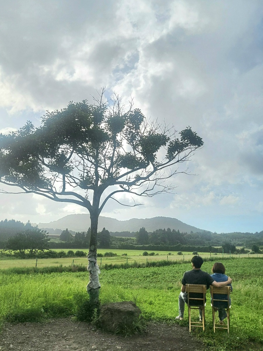 걷다 보니 밭이 나오고, 탁 트인 전망을 배경으로 사진을 찍을 수 있는 포토존도 나온다. 그때 햇살은 비추는데, 비는 더 거세진다. 빗줄기가 햇살에 부서지면서 삼나무 숲 사이로 흩뿌려지는 그 묘한 분위기. 그 비현실적인 분위기에 무언가 등장했다.