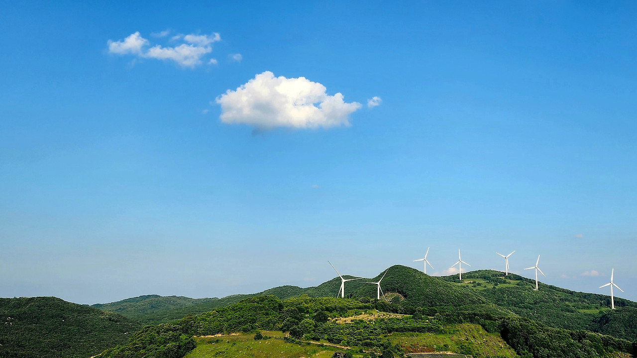 예로부터 화산에 바람이 많이 불어 설치된 동쪽 자락 풍력발전기