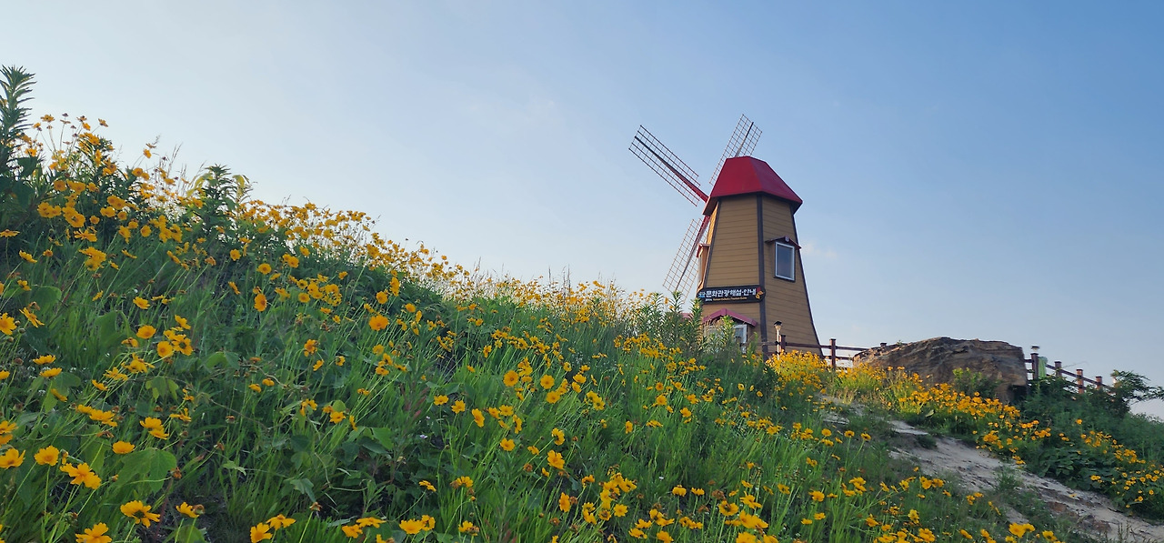 주차하고 내리자 노란 금계국이 바람에 하늘거리며 반겨준다. 산성마을의 북쪽에 자리한 풍차전망대는 작은 풍차가 서 있어서 이름이 붙여졌다. 하늘전망대보다는 조금 낮지만, 북향이라 구름과 하늘을 감상하기에 더할 나위 없이 좋다.