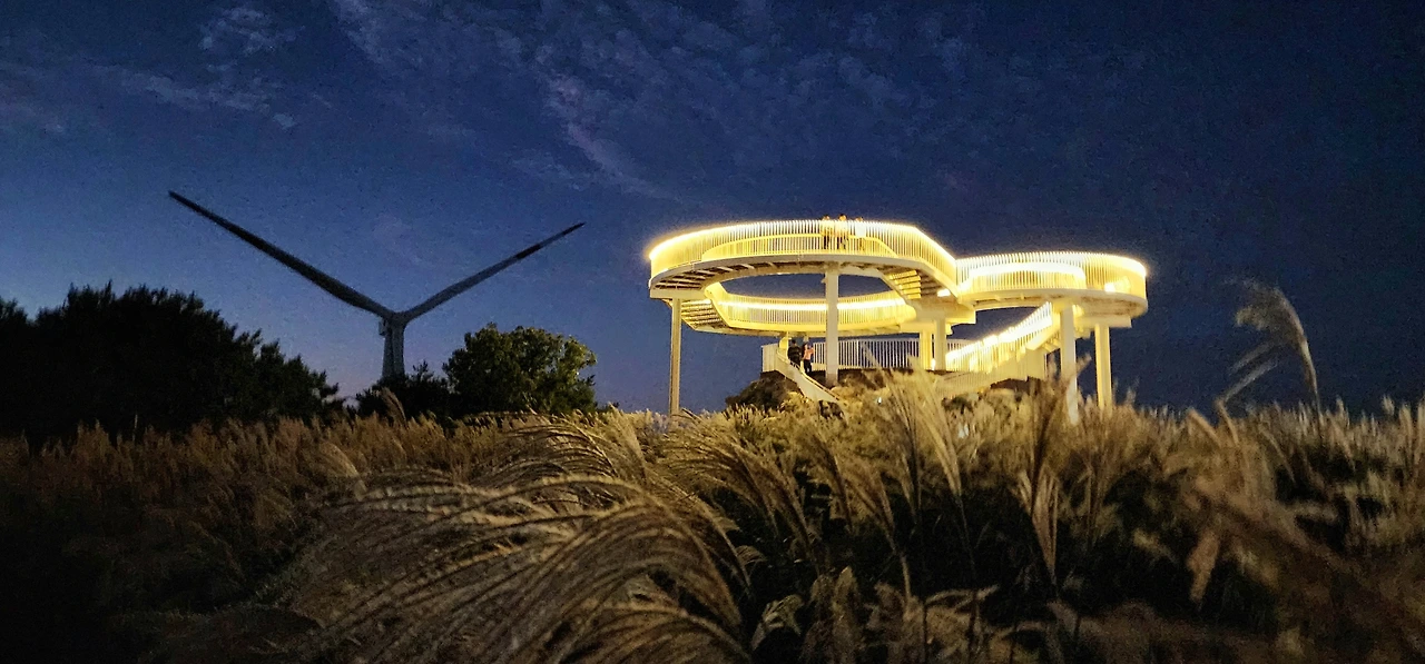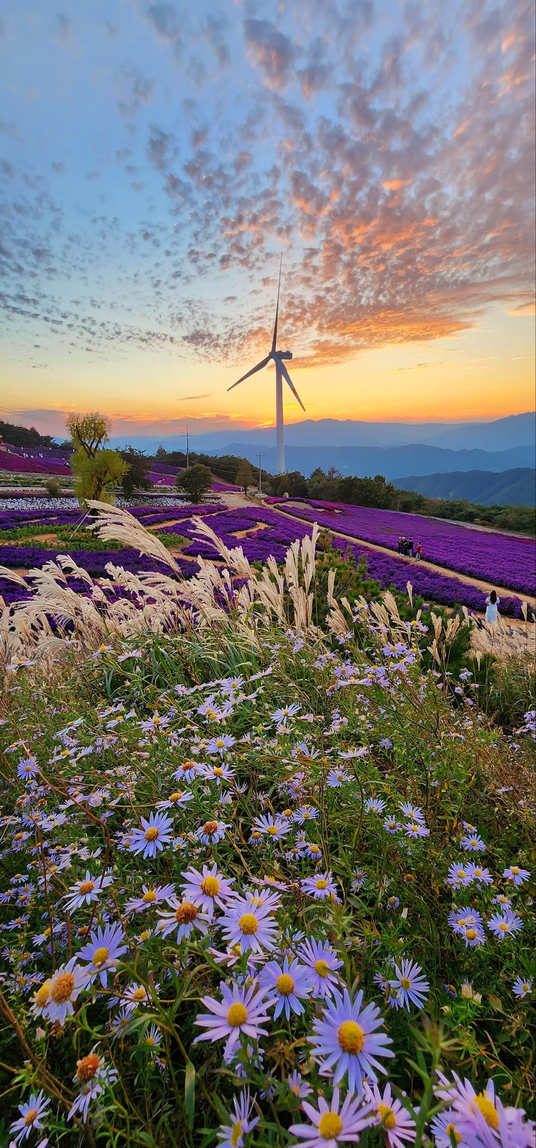 꽃의 아름다움에 취할 무렵 해가 고개를 넘어간다. 노을빛이 점차 붉어진다. 옅은 구름 무리는 노을빛을 다채롭게 만들어 준다. 커다란 바람개비 같은 풍력발전기도 배경이 된다. 꽃과 노을, 그리고 풍력발전기가 함께 어우러져 이곳의 노을 풍경은 카메라조차 내려놓을 만큼 숨 막히게 아름답다. 그저 멍하니 바라볼 수밖에...