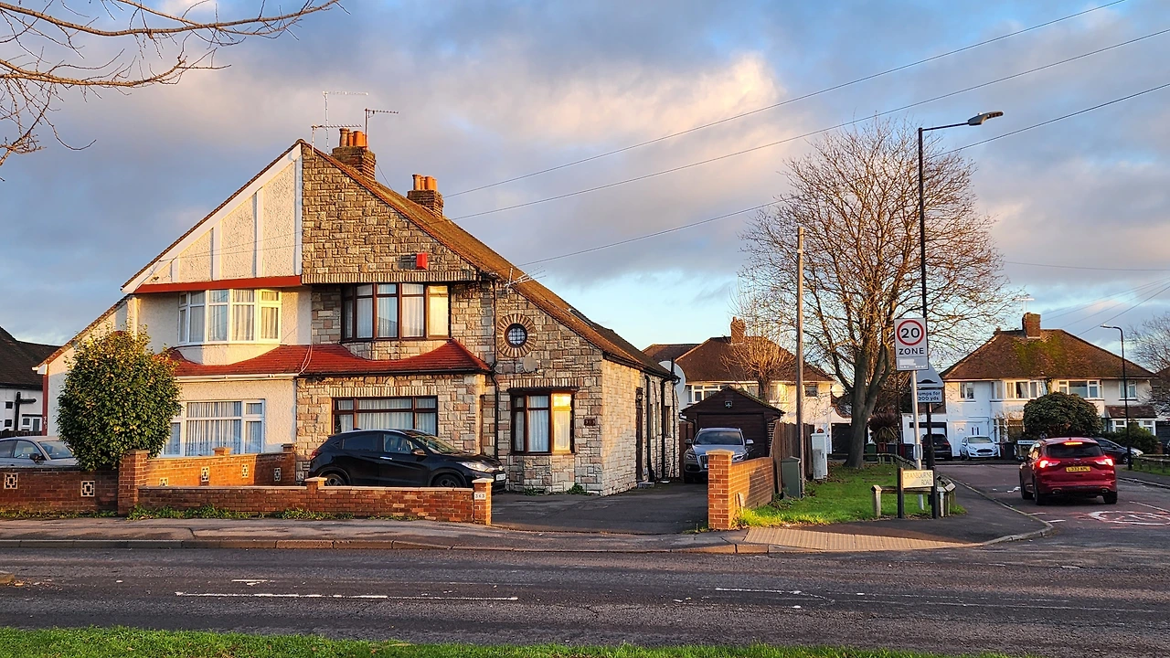 영국의 외곽 주택들은 대부분 도로 방향으로 현관이 나 있었다. 그리고 정원은 그 반대쪽에 있었다. 걷다가 보니 집들의 특이한 점을 발견했다. 같은 건물인데 반반이 새시가 다르거나, 페인트칠이 다른 경우가 많았다. 가만히 보니 건물은 하나지만 두 가구가 각각 관리하고 사는 모습이었다. 지붕색이 다르거나 아예 반쪽만 수리된 경우도 있고, 건물 중앙을 나누는 화단이 있는 경우도 있었다.