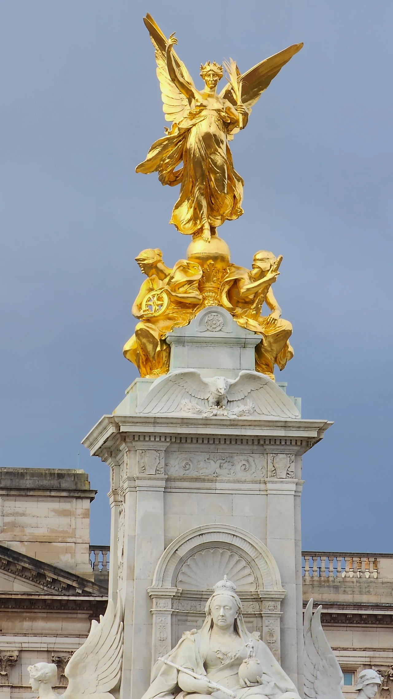 버킹엄 궁전 정문 앞에는 빅토리아 여왕(Queen Victoria)의 장기 재위와 그녀의 통치 업적을 기리기 위해 기념비가 세워져 있다. 여왕의 조각상 및 여러 상징적인 조각상들로 구성되어 있지만, 가장 눈에 띄는 것은 기념비의 꼭대기를 황금빛으로 장식하는 승리의 여신 니케 상이다. 사람들은 이를 배경으로도 사진을 많이 찍었다. 아무래도 빅토리아 여왕보다는 일반인들에게 승리의 여신 니케나 '나이키'라는 스포츠 브랜드 이름이 더 친숙하게 느껴지는 건지도 모르겠다.