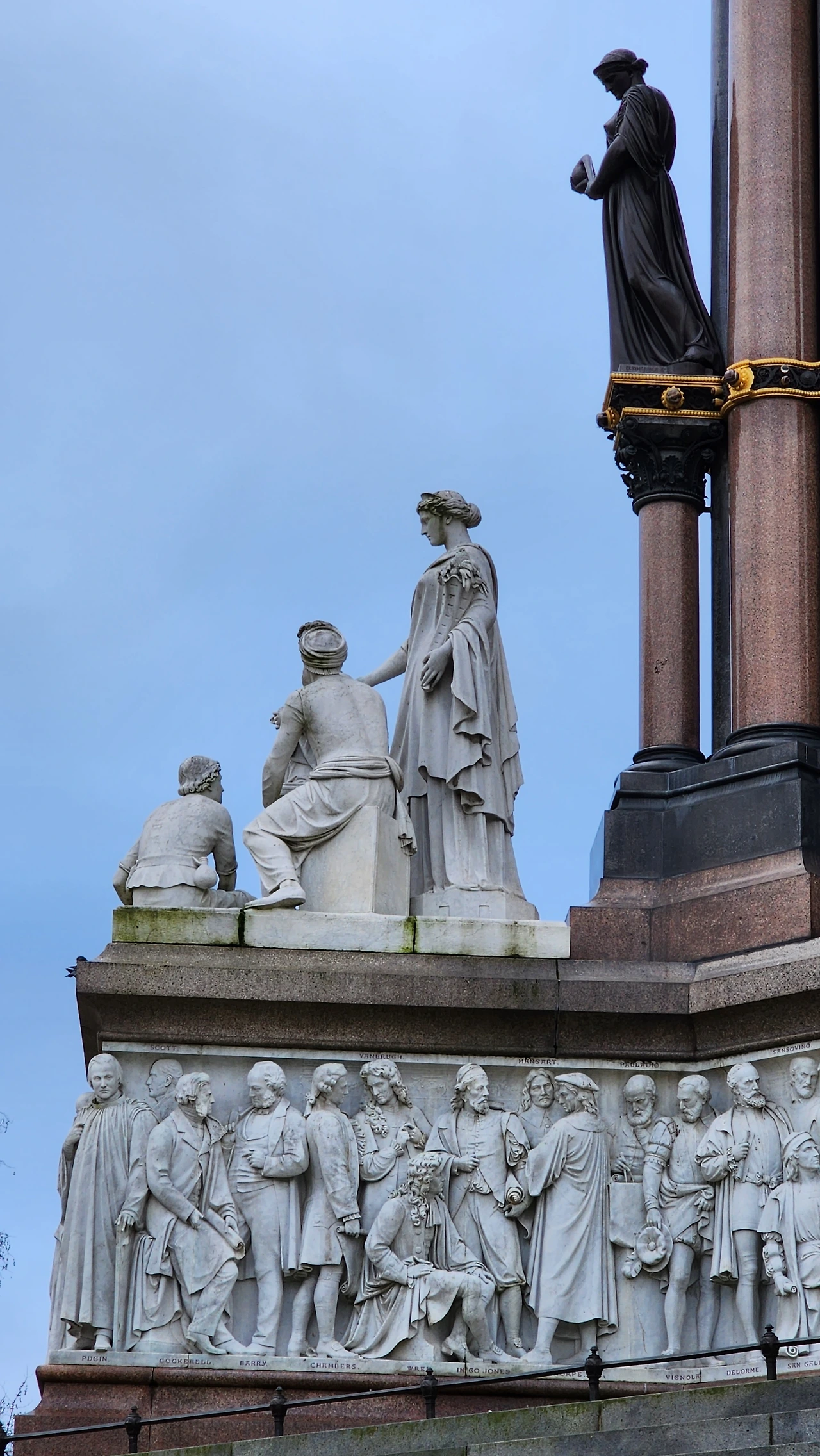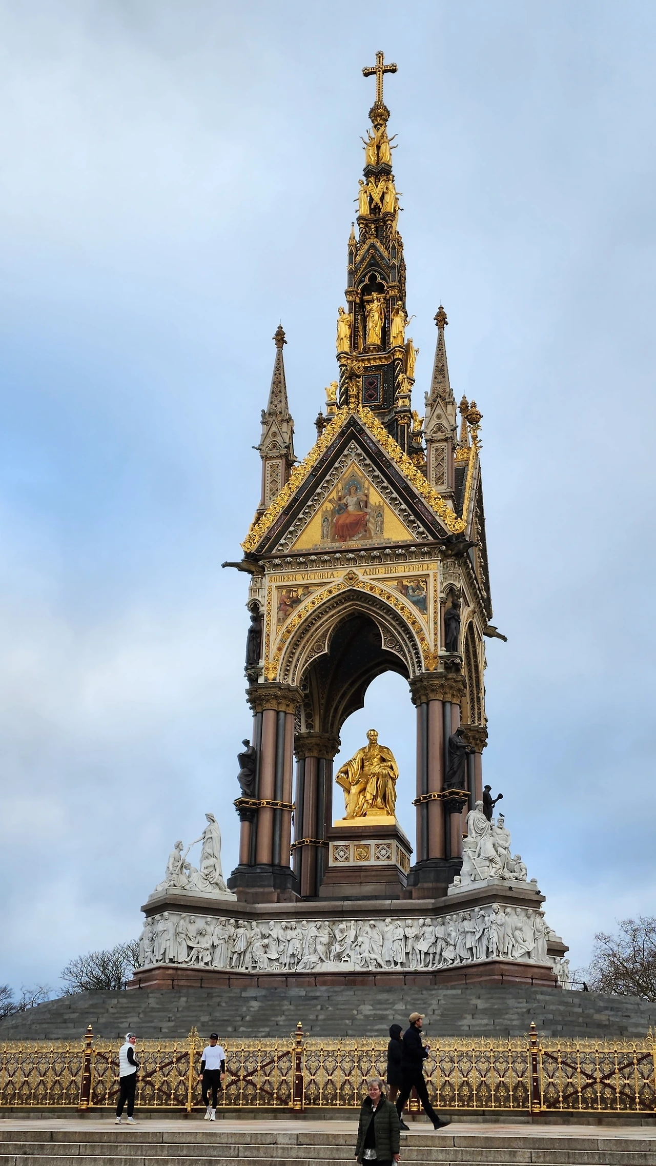 우리가 버스에서 내린 근처에 빅토리아 여왕의 남편 알버트 공을 기리는 로열 알버트 홀과 그의 기념비가 있었다. 알버트 기념비는 화려하고 거대한 황금빛 동상 모습이었다. 당시 해가 지지 않는 나라였던 대영제국의 높은 위상을 보여주는 듯하다. 빅토리아 여왕은 1861년에 일찍 세상을 떠난 사랑하는 남편을 기리기 위하여 이 기념비를 세웠다고 한다. 알버트 공의 손에는 그가 주도했던 1851년 만국 박람회의 안내장이 들려있었다.