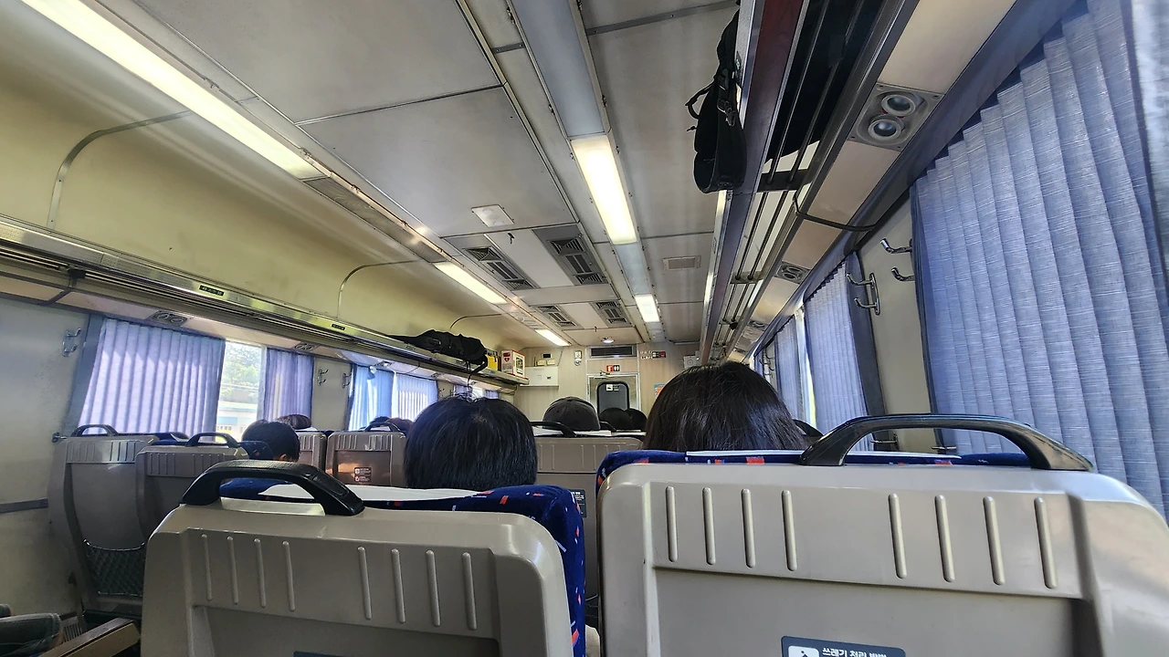 플랫폼에 안내 멘트가 나오자, 잠시 후 전조등을 환하게 비추며 무궁화호 열차가 들어온다. 공항의 설렘과는 또 다른 낭만과 두근거림이 느껴진다. 묵직한 굉음이 잦아들고 끼익 하고 멈춘 기차에 올라탄다.