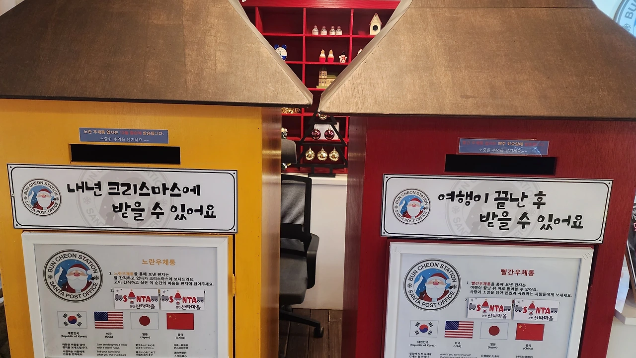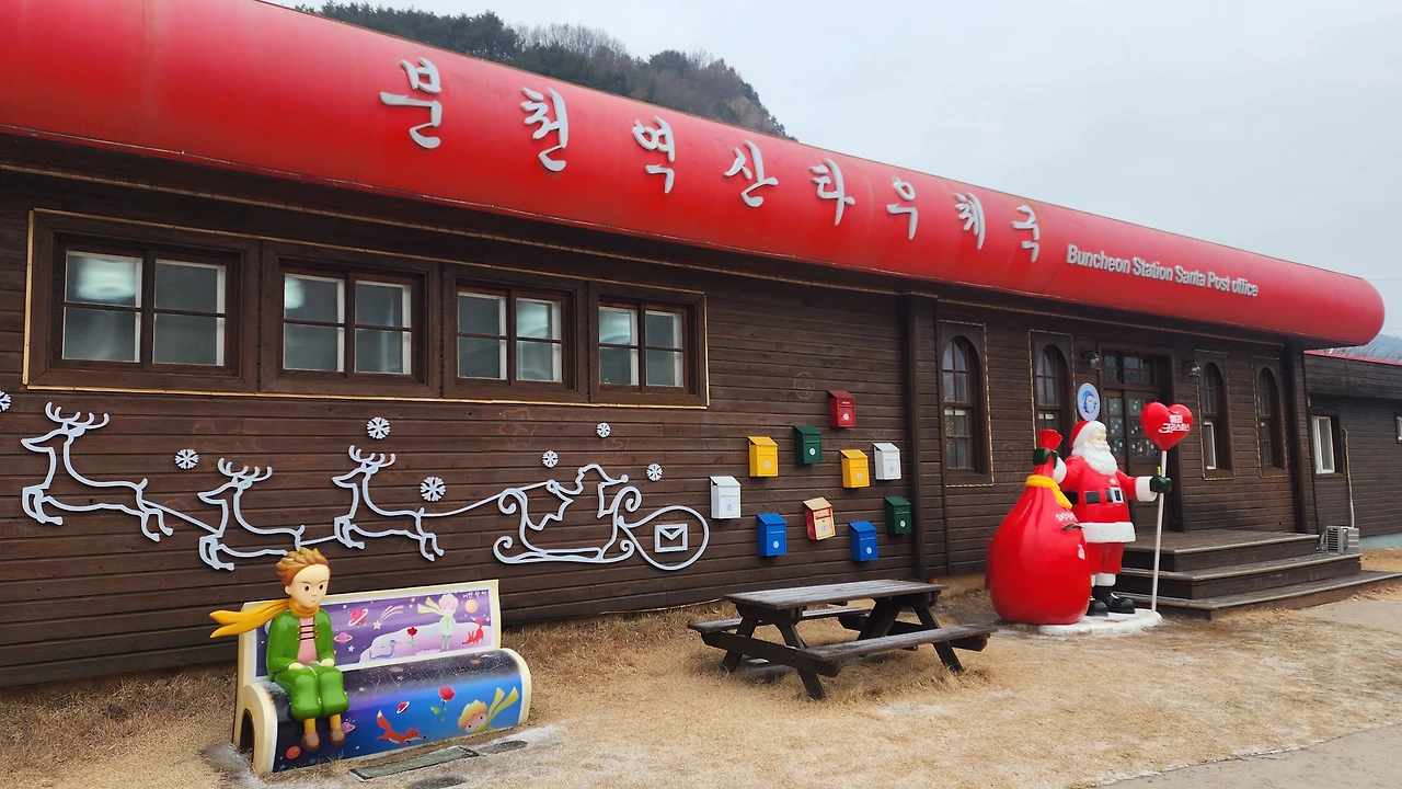 분천역 작은 역사 바로 옆에 분천산타우체국이 있다. 추워서 몸도 녹일 겸 들어가 본다. 크리스마스 분위기로 실내가 잘 꾸며져 있다. 둘러보니 '느린 우체통'이 있고, 산타마을이 그려진 엽서를 판매하고 있다.