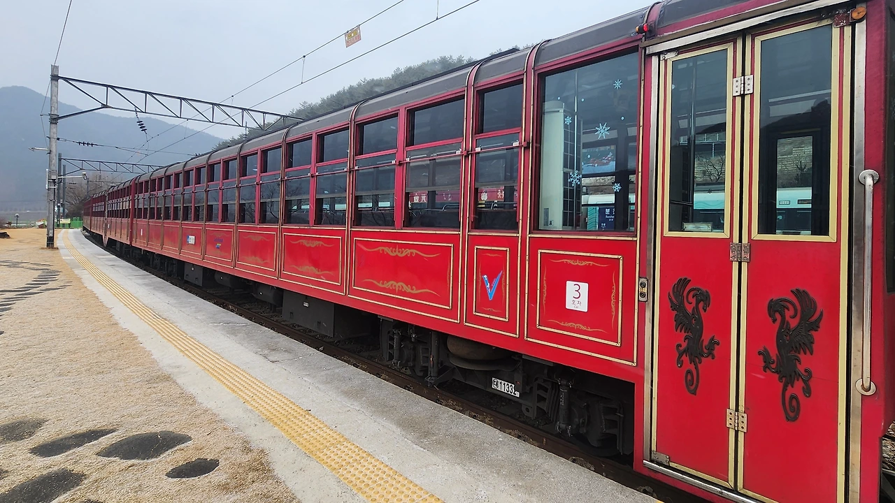 분천역에서 시선을 사로잡는 것은 단연 열차다. 잠시 뒤 우리가 타고 출발할 V-트레인이 플랫폼에 정차해 있다. 창이 넓은 빨간 열차는 크리스마스 분위기와 어울리기도 하고, 외관이 무척이나 이국적이다. 알프스 산악 구간을 달리는 스위스 열차 같기도 하고, 런던 킹스크로스역에서 해리포터가 호그와트로 타고 가는 열차 느낌도 있다. 살짝 낡은 모습이 오히려 감성을 돋게 한다. 출발 시간이 가까워지니 사람들이 하나둘 플랫폼으로 모여든다. 다들 출발하기 전에 빨간 열차 앞에서 사진을 찍는다.