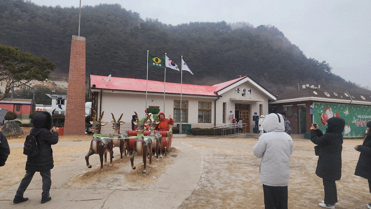 산타할아버지도 구경하고, 동네 곳곳의 핫플레이스를 돌아보고 언덕 위 분천역으로 올라간다. 분천역 앞에는 눈썰매를 끌고 있는 산타와 사진을 찍을 수 있는 포토존이 있다. 누구나 산타 옆에 앉아 보고 싶게 만드는 그 썰매에 사람들이 다들 활짝 웃으며 사진을 남긴다.