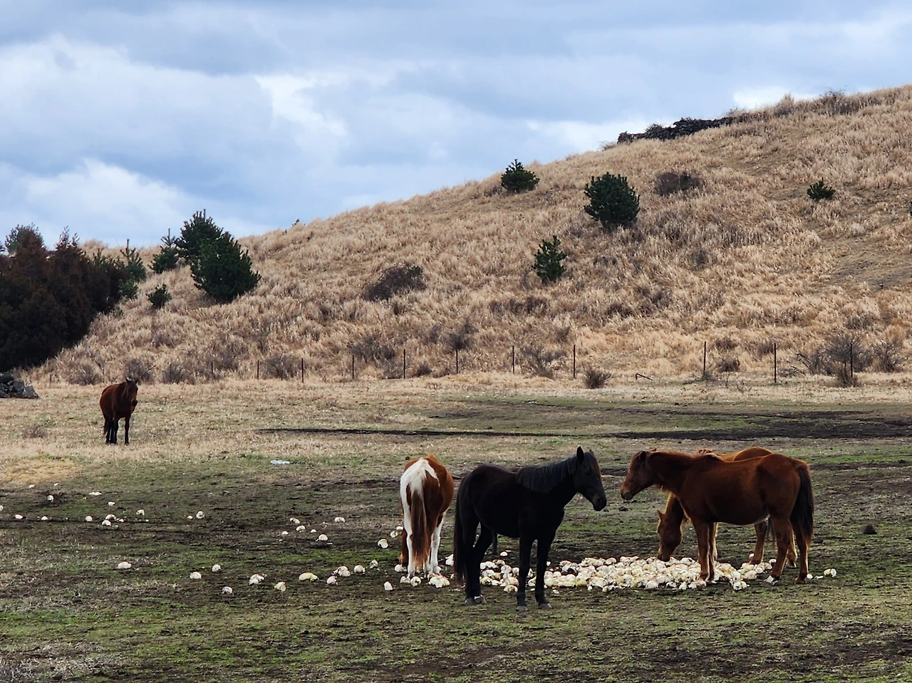 겨울이지만 우리처럼 용눈이오름을 찾아온 몇몇 탐방객들은 이내 발길을 돌렸다. 불과 한 달 뒤부터 탐방로가 다시 개방된다고 한다. 눈앞에서 첫사랑을 만날 기회가 날아간 것 같았다. 많이 아쉬운 마음에 우리는 입구를 한참이나 서성였다. 탐방로 울타리 너머에는 말들이 바람을 맞으며 무심하게 먹이를 먹고 있었다. 오름의 능선과 말을 번갈아가며 한참 동안 바라보다가 그냥 돌아왔다.