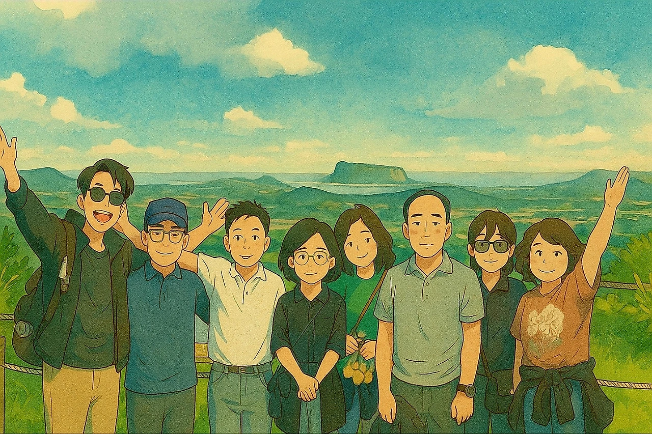 성산일출봉이 보이는 정상 부근에서 탐방로가 막혀 있어서 현재 오름의 둥근 능선을 한 바퀴 돌아볼 수는 없다. 하지만 정상에서 오름이 보여주는 전망은 말조차 잊은 채 바라보게 만든다. 그리고 올라오는 사람마다 일출봉으로 배경으로 사진을 찍는다. 우리도 앞선 일행과 서로 단체 사진을 찍어 주었다. 덕분에 네 부부가 함께 나온 기념사진도 남길 수 있었다.