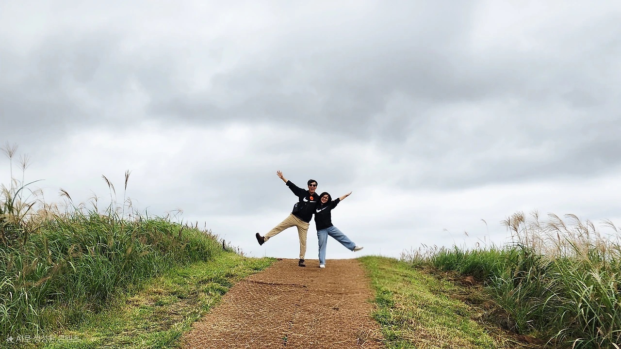 어제 서귀포올레시장에서 사 온 귤을 까먹으면서 하산한다. 서로 사진을 찍어주며 즐겁게 내려온다. 작은 봉우리를 다시 올라가는 다른 부부의 뒷모습이 보기 좋다. 아예 멈춰 세우고 부부별로 제대로 사진을 찍는다. 평소 같으면 어색해 할 수도 있을 텐데 오늘의 기분과 분위기는 부부마다 한껏 포즈를 잡게 만든다. 아마 용눈이오름의 매력 덕분이 아닐까? 부드러운 곡선의 능선이 마음을 부드럽게 만들어 주고, 어느 방향으로 바라보아도 아름답고 평화로우니...