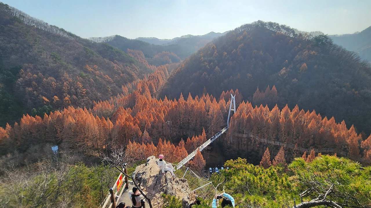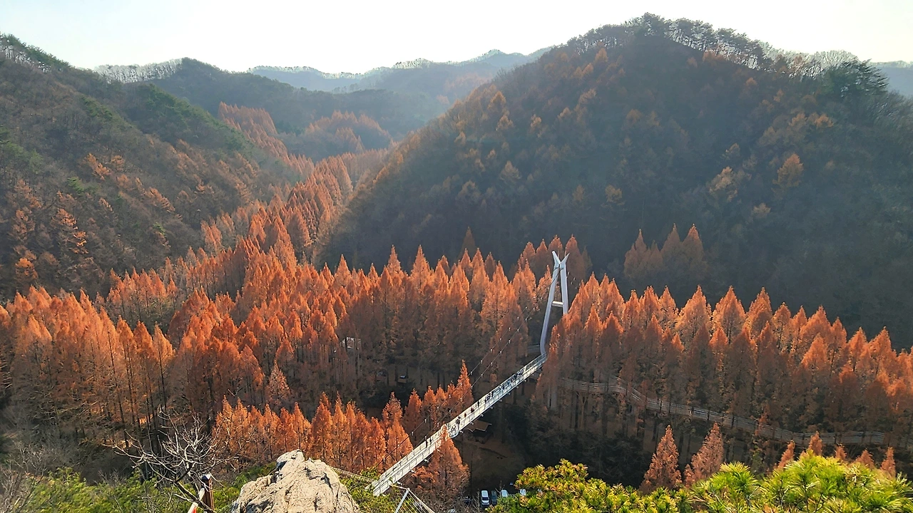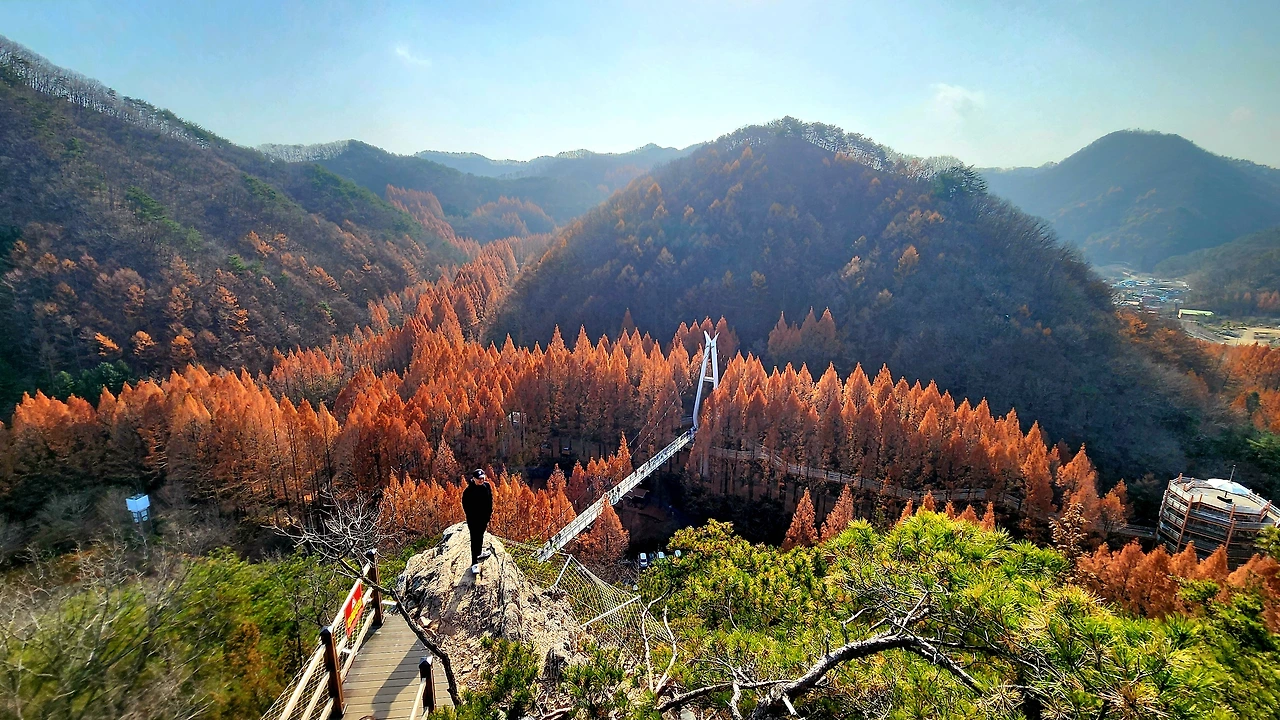 흐뭇한 마음으로 이제 할 일은 바로 풍경 감상이다. 아까 건너온 출렁다리와 숲을 내려다본다. 흔히 장태산을 검색하면 나오는 바로 그 풍경이다. 마지막 단풍놀이를 떠나온 충분한 보상이 되는 장면이다.