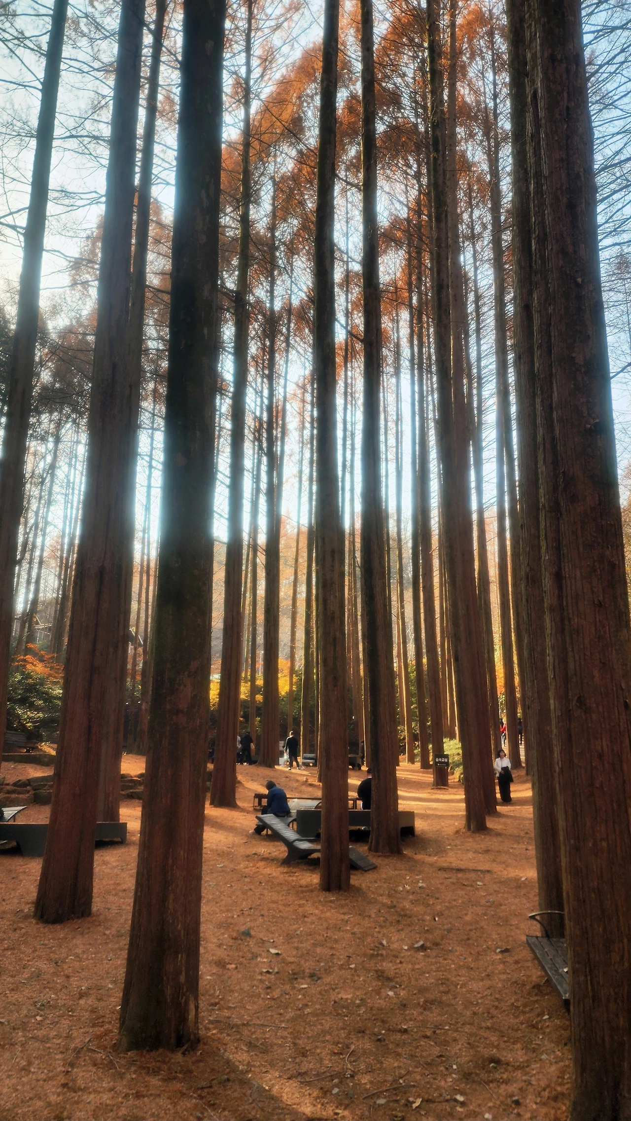 5 주차장 좋은 자리에 주차하고 고개를 올려다본다. 이 정도면 나쁘지 않다. 예상처럼 단풍이 든 많은 잎들이 이미 떨어졌지만, 나무 윗부분에는 주황색 단풍이 아직 제법 남아 있다. 뾰족한 나무 꼭대기가 살아 있다. 마음을 비우고 온 덕분인지 오히려 감사하다.