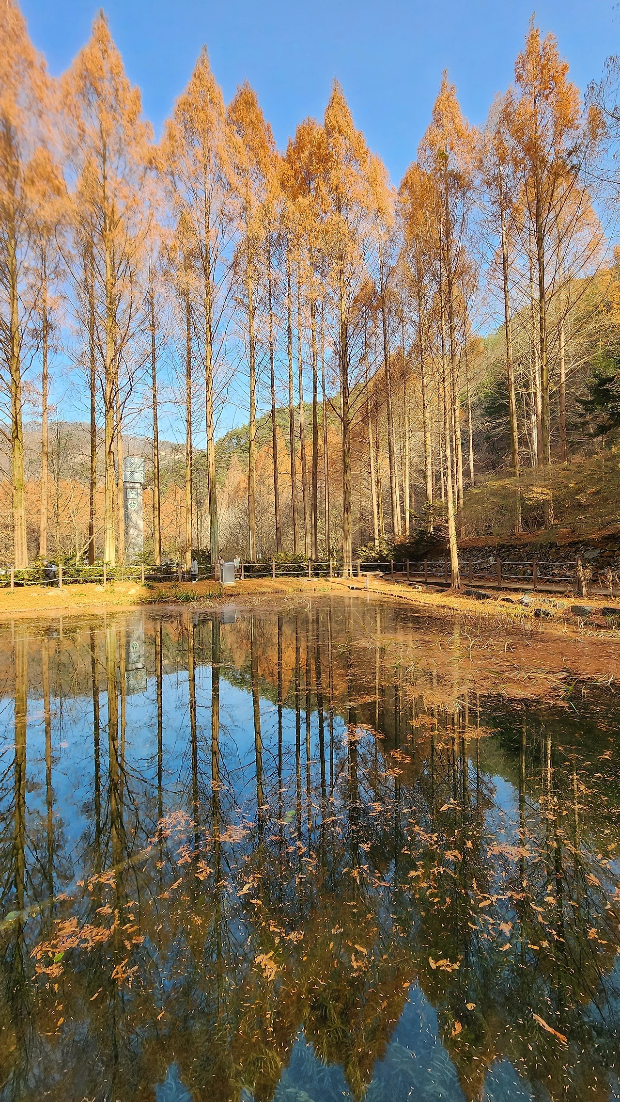 계단을 헐떡이며 올라와 찬바람을 맞은 아내가 기침이 난다고 한다. 내려와서 따뜻한 어묵 하나 사 먹었다. '긴급 국물 처방'을 받은 아내는 증상이 다소 나아진 모양이다. 이제 배도 채웠으니 좀 걸을까. 메타세쿼이아 숲 가운데 연못이 있다. 연못 위 데크를 걷는데, 물 표면에 나무가 떠 있다. 이런 장면은 놓칠 수 없지. 얼른 카메라를 꺼내 반영샷을 찍는다.