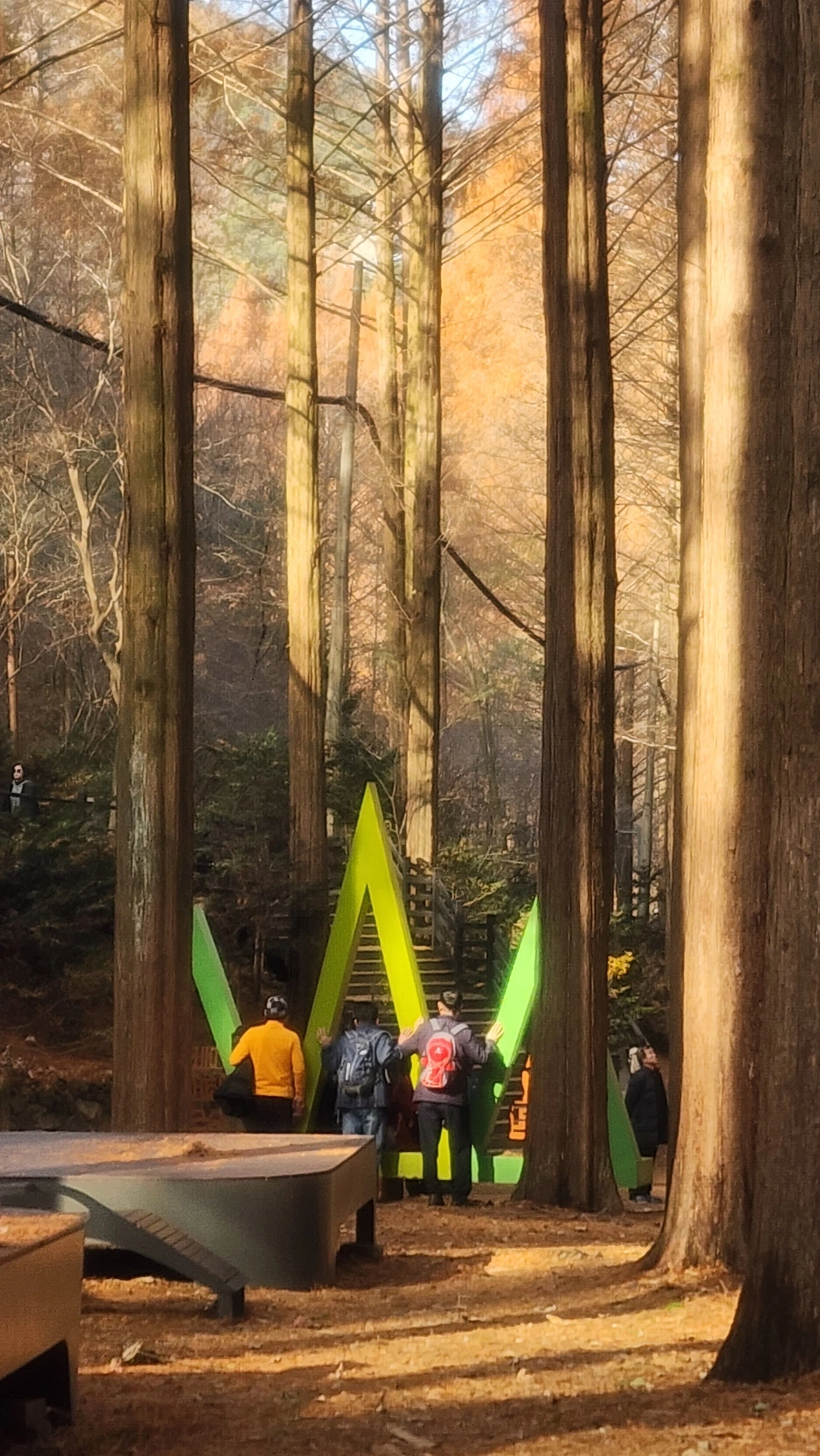 방문객들에게 인기 많은 출렁다리와 멀리 포토존에는 여전히 사람들로 붐볐다. 앞사람들을 따라 올라간다. 안개가 걷혔지만 휴양림은 촉촉하다. 갈색 낙엽이 쌓인 바닥이 폭신폭신하다. 무엇보다 숲 향기가 좋다.