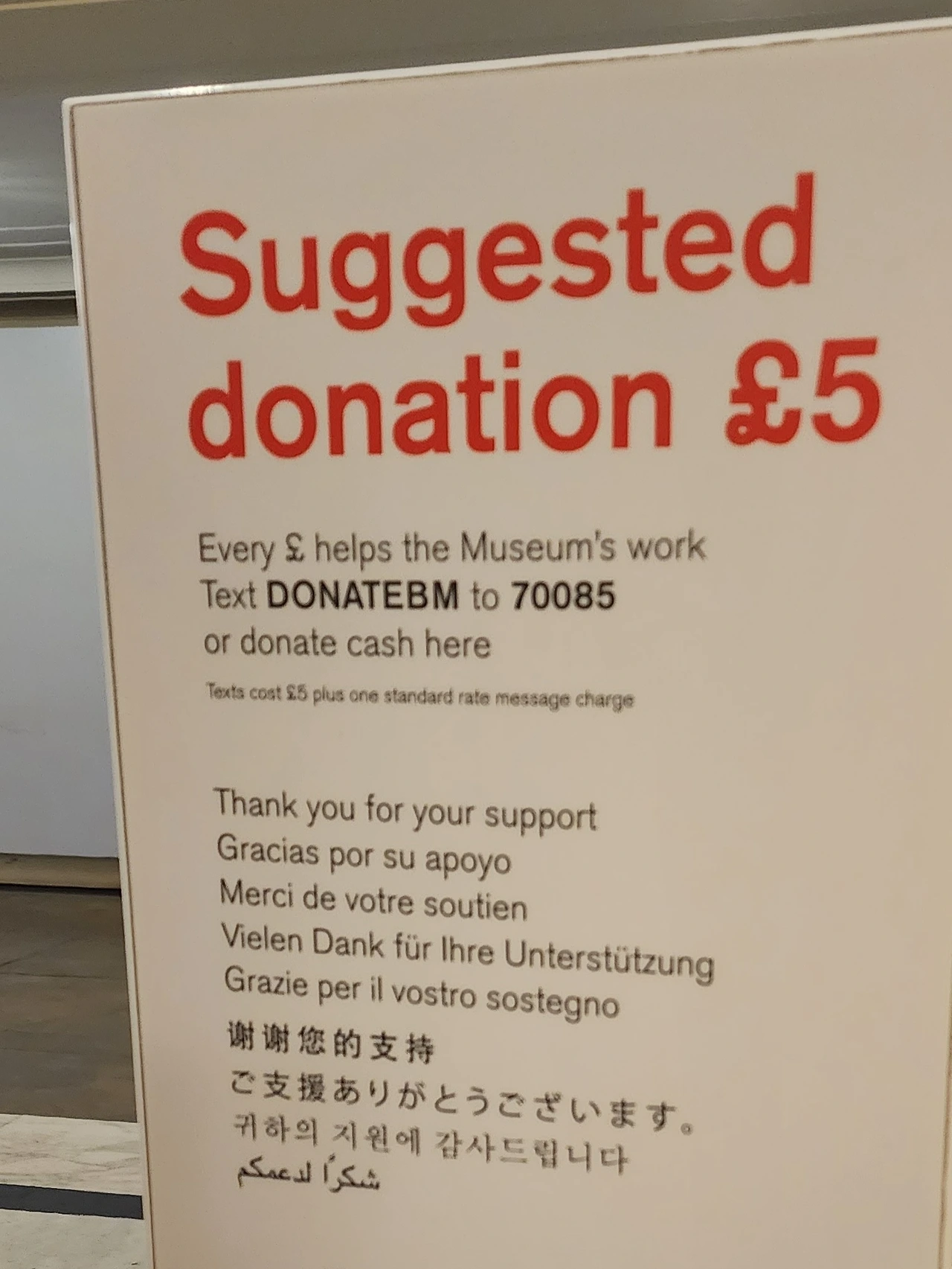 보안 검색대를 통과하여 후문으로 입장했다. 박물관 입장료는 무료였다. 대신 입구에 기부를 받는 함이 있었다. ‘도네이션 5파운드’라는 표시와 함께 각국 언어로 감사 인사가 적혀 있다. 한글로도 ‘귀하의 지원에 감사드립니다’라고 제대로 쓰여 있었다. 영국은 박물관의 나라라고 불릴 만큼 많은 박물관이 있고, 대부분 무료입장이다. 이는 많은 사람들이, 특히 학생들이 쉽게 박물관을 이용할 수 있다는 점에서 긍정적으로 보였다.