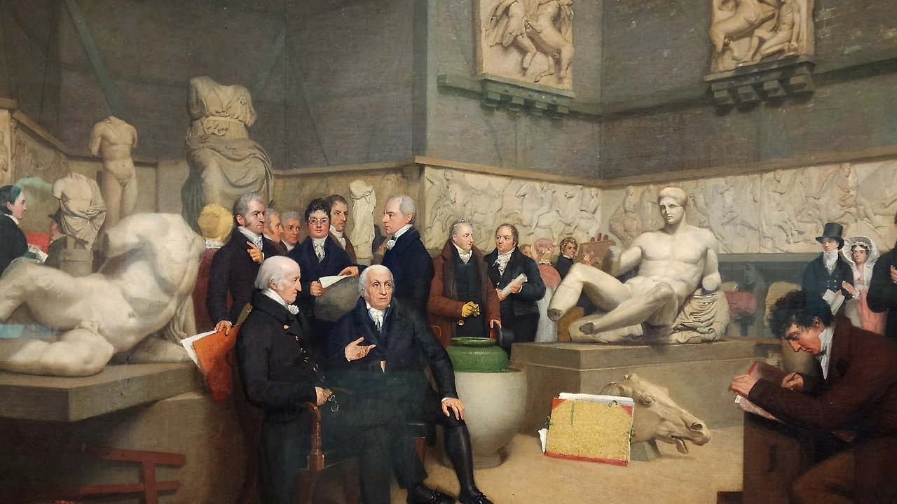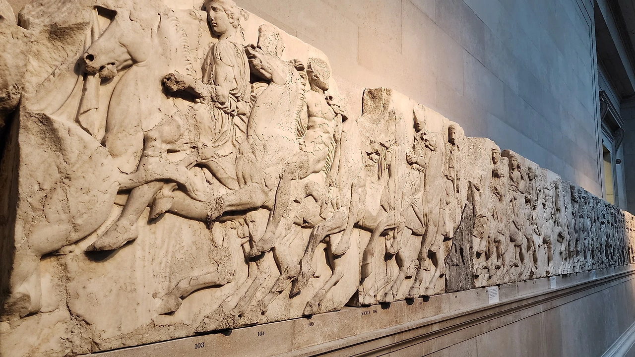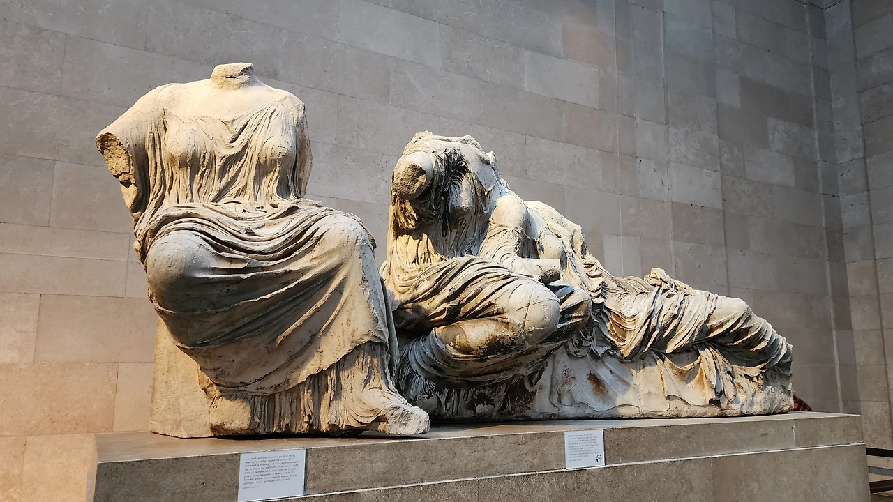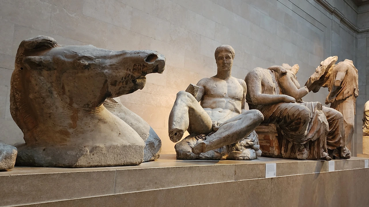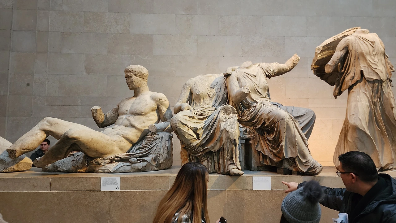 엘긴 마블은 그리스가 오스만 제국(터키의 전신)의 지배를 받던 시절, 영국의 오스만 제국 대사였던 토마스 엘긴 백작이 그리스에서 반출한 파르테논 신전의 대리석 유물이다. 이 유물들은 파르테논 신전 지붕 아래 삼각형 공간인 페디먼트(Pediment)의 조각상들과 신전 상단 벽면(프리즈)에 장식되어 있던 부조들이다. 이 부조들을 길게 떼어와 전시해 두고 있었는데, 그 양이 엄청났다. 또, 지붕을 여인들이 떠받치는 모양의 기둥인 카리아티드(Caryatid)의 진품 기둥 하나도 이곳에 있었다. (나머지 진품 5개는 그리스 아크로폴리스 박물관에 있다. )