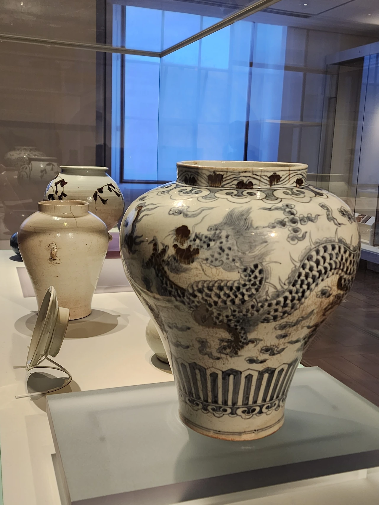 한국관에 들어서면 일단 ‘한영실(韓英室)’이라는 현판을 단 한국 기와집 모형이 눈에 들어온다. 한국의 전통 가옥 구조를 보여주며, 바닥 전체가 우리나라에서 직송한 나무로 되어 있어 정성을 느낄 수 있다. 전시 유물로는 용이 그려진 백자, 달항아리, 병풍 등이 놓여 있었다.