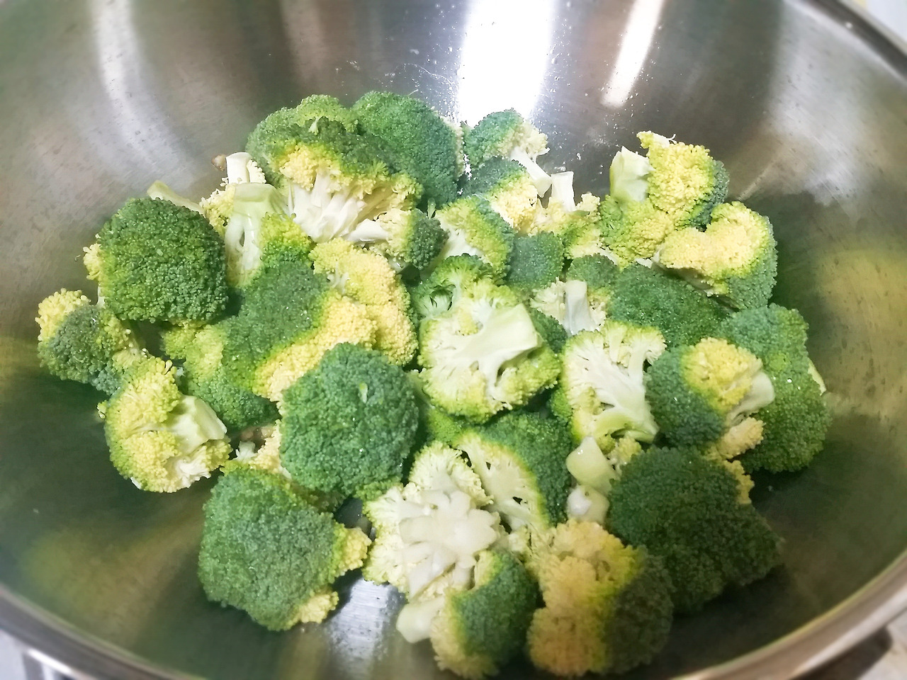 -브로콜리: 큰 줄기는 제외하고 꽃을 포함한 작은 줄기부분만 너무 크지 않게 잘라놓는다. 큰 브로콜리도 예쁘지만, 나는 조리하는 시간을 아끼기 위해서 꽃부분의 지름이 3~4센치가 넘는 것은 전부 잘라놓았다.