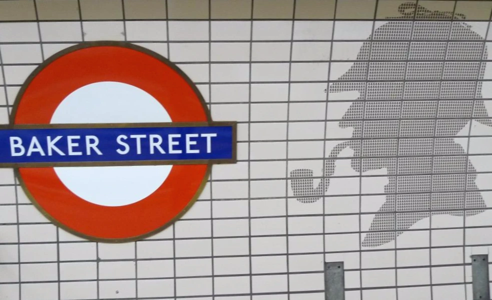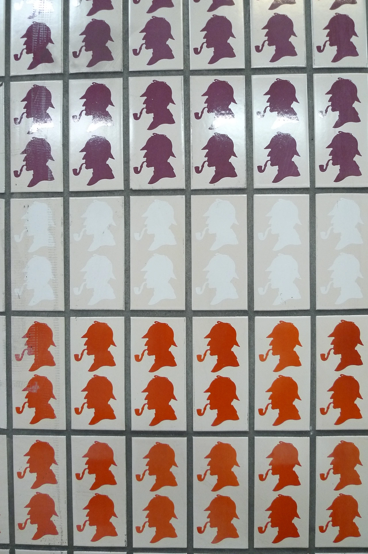 어쨌거나 나는 지하철역을 겨우 찾아서 지하철을 타고, '베이커 스트리트'라는 이름만 들어도 쿵덕쿵덕 가슴을 뛰게하는 그 역에 내렸다. 지하철에서 내리자, 사냥모자와 굽어진 파이프를 문 유명한 홈즈의 실루엣이 지하철 벽면에 그려져 있다. 타일에도 작은 실루엣들이 잔뜩 그려져 있어서 참으로 재미있는 인테리어다. 나는 자신도 모르게 '꺄아'하고 환호성을 질렀다.