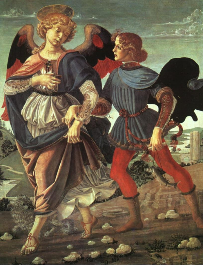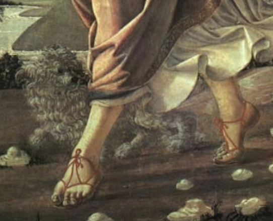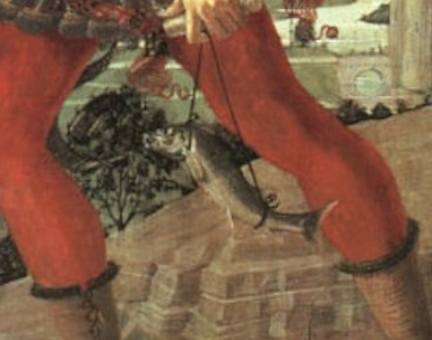 이 작품에서 레오나르도 다 빈치가 그린 부분은 강아지와 물고기이다. 여기서 그는 일반적이지 않은 자신만의 방법을 적용하여 새로운 채색기법으로 그림을 그리게 된다. 하지만 이 기술은 결국 그의 최초작이자 실수로 남게 된다. 이 작품에서 강아지를 자세히 보면 금방이라도 투명해질 듯 뒤의 배경이 비춰 보이는 것을 알 수 있다. 더불어 물고기도 마찬가지 형상으로 보인다.