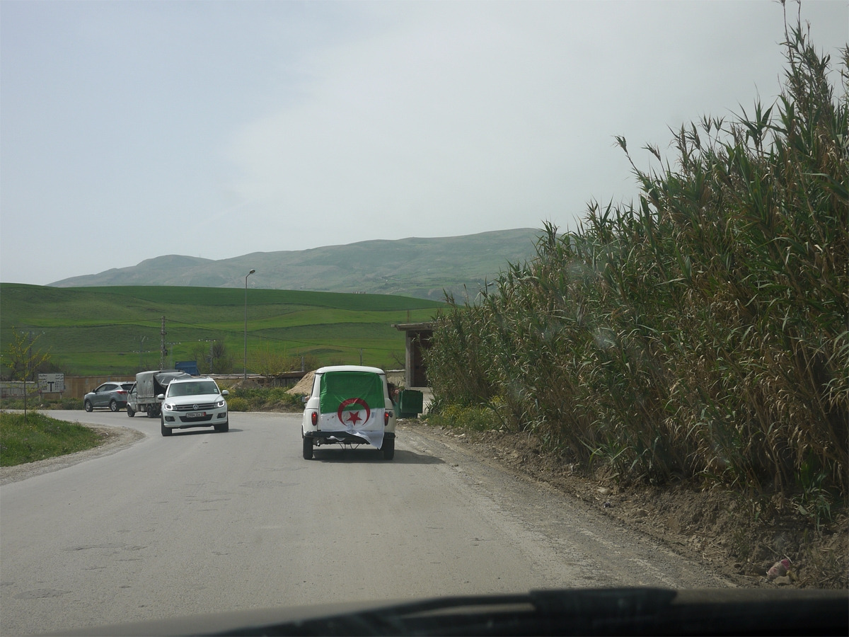 내가 가는 길에 동행이 되어준 어느 오래된 차. 뒤편에 알제리 국기를 달아놓았다.마침내 드높은 산들 사이에 푹 파묻힌 빛바랜 어느 언덕배기에 마치 백골들의 숲과도 같은 누르스름한 그 잔해가 솟아나 보이게 되면 제밀라는 오로지 단 하나 우리를 세계의 고동치는 심장부로 인도해줄 수 있는 저 사랑과 인내의 교훈의 상징과도 같은 모습을 띤다. (위의 책, p.24)