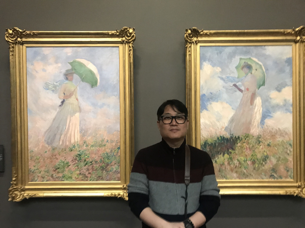 이 그림은 1875년 모네가 사랑하는 아내 카미유와 아들 장을 그린 ‘양산을 쓴 여인’이다. 지난겨울 파리에 가기 전부터 오르세미술관에 가면 꼭 감동하고 와야지 마음먹었던 그림이었다. 7일 동안 파리에 있으면서 오르세미술관을 두 번이나 가서 두 개의 ‘양산을 쓴 여인’을(오르세미술관 작품은 여인의 오른쪽과 왼쪽 모습을 그린 두 점의 작품이었고 나란히 전시되어 있었다.) 보았지만, 안타까운 건 내가 정말 보고 싶어 했던‘양산을 쓴 여인’은 아니었다. 모네의 그림은 응당 오르세에 있을 거로 생각했는데, 내가 보고 싶었던 ‘양산을 쓴 여인’은 워싱턴국립미술관에 전시되어 있었던 것. 그나마 위안이었던 것은 모델과 구도, 붓터치. 하늘이 비슷하다는 것이었다. 처음엔 같은 시기에, 같은 여인을 그린 것이 아니었을까 생각했다. 그런데 자료를 찾다 보니 워싱턴국립미술관 작품은 1875년에 그렸고, 오르세의 두 작품은 모두 1886년에 그렸다. 11년의 차이가 난다. 그리고 그 차이, 오르세 작품은 부드러운 붓터치로 하늘과 언덕 그리고 여인의 모습을 조금 뭉개듯 표현했다면, 워싱턴국립미술관 작품은 눈부시게 화려한 하얀색 원피스에 푸른 하늘이 덧입혀져 있는 모습을 조금은 선명하게 표현하고 있어 그림 속 인물이 누구인지를 확연히 알 수 있다.