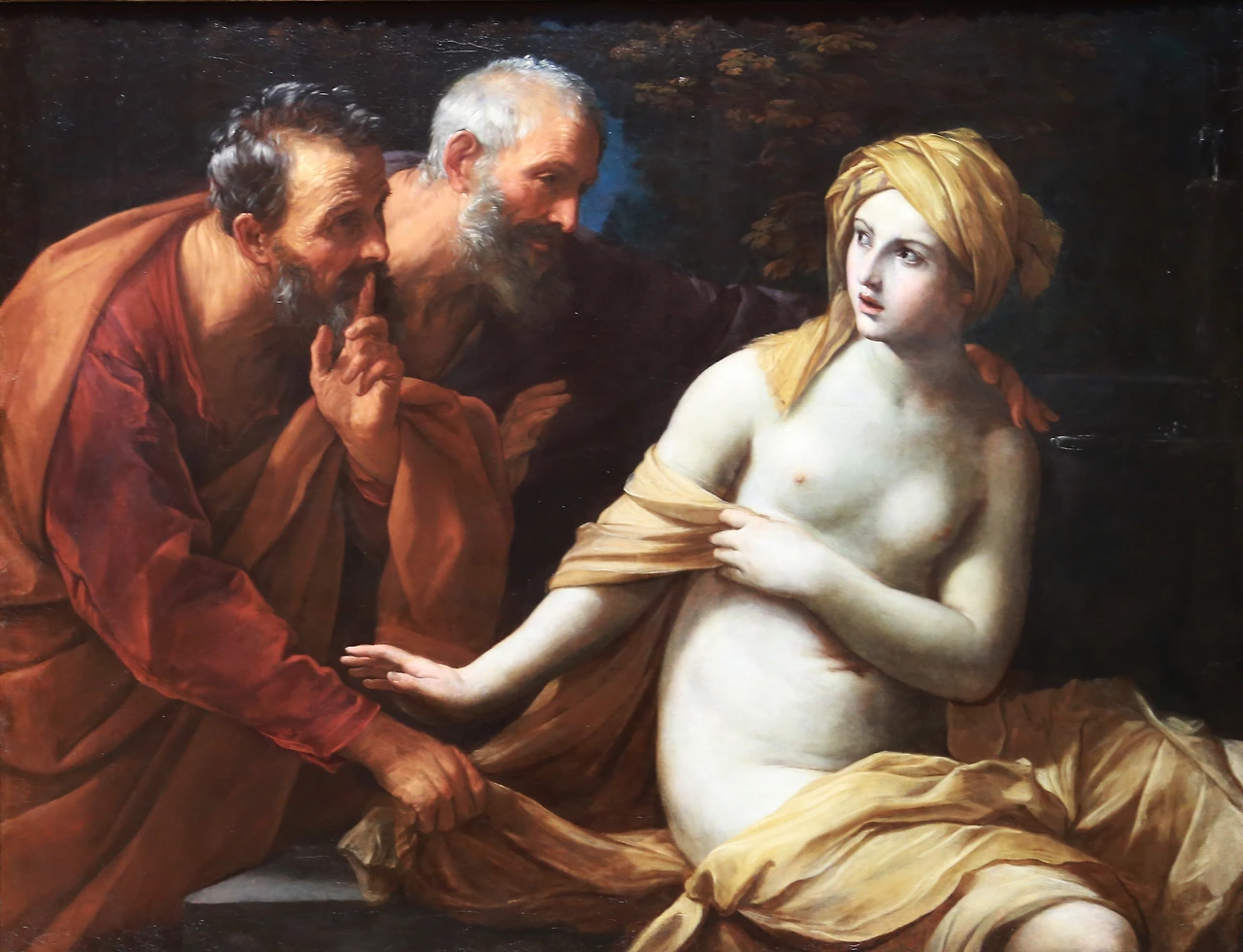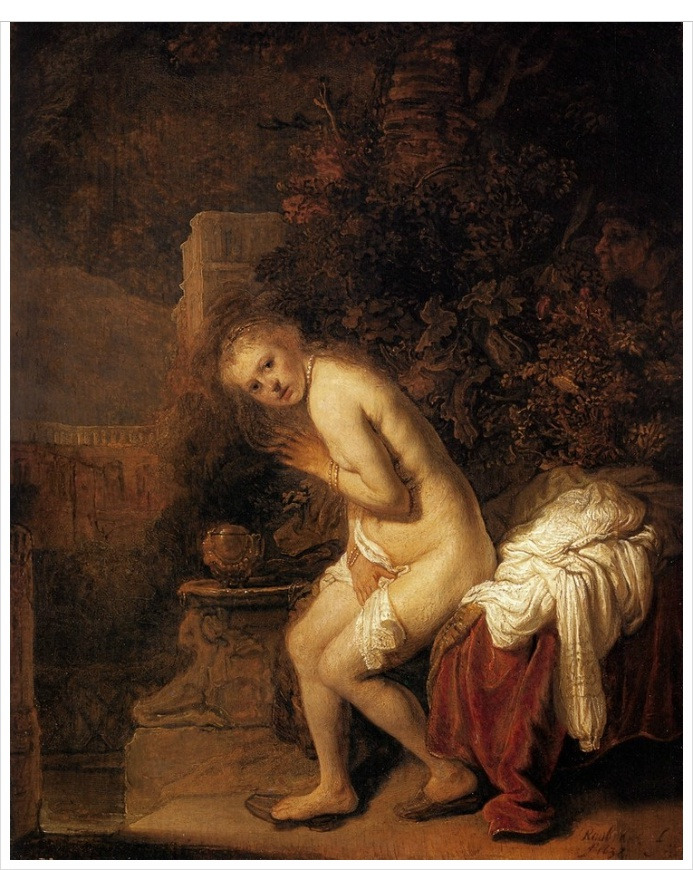 성경의 구약시대에 ‘Don't Touch Me.’를 외쳐 자신을 지킨 여인에 대한 이야기를 소재로 한 그림이 있다. 바로 틴토레토(1519~1594)의 ‘수산나의 목욕’이다. 수산나 이야기는 성경에서 외경으로 분류되는 다니엘서 13장에 나온다. 바빌론에 요야킴의 아내 수산나라는 미모가 출중한 여인이 있었다. 요야킴은 큰 부자로 넓은 정원을 가지고 있었고, 마을에서 존경받는 사람인지라 마을 사람들이 집에 자주 드나들었는데, 마을의 원로들이 수산나를 보고 음욕을 품게 되었다. 그러던 중 무더운 어느 여름날 두 원로 훔쳐보는줄도 모르고 수산나가 더위에 정원에서 목욕을 한다. 두 원로는 이때다 싶어 보는 것을 넘어 뛰쳐나와 수산나에게 잠자리할 것을 요구한다. 그러지 않으면 젊은이와 간통했다 거짓 증언 하겠다고 협박까지 한다. 물론 수산나는 그들에게‘Don't Touch Me.’,를 날렸고 재판에서 사형 선고를 받는다. 그리고 대부분의 이야기가 그렇듯 사형집행이 이뤄지려는 찰나 어린 다니엘이 등장 여인의 누명을 풀어주게 된다.(어떻게 누명을 풀게 되었는지 궁금하다면 다니엘서 13장을 읽어보시길….)