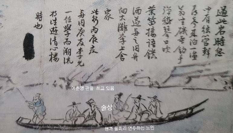 관을 쓴 사람이 여춘영이다. 관만 쓰고 우리를 배웅하러 강 머리에 나왔는데, 손을 잡아 배에 태우고 사공을 불러 출발을 재촉하였다. 뱃놀이하고 있는데 어디선가 현과 피리 소리가 들린다. 고기 잡는 한 노인이 해금과 풀피리를 불고 있다. 뱃놀이에 노래가 빠질 수는 없지. 노인까지 배에 태우고 음악 듣고 술 한 잔 나누며 대탄(지명)의 이상사의 집으로 간다.