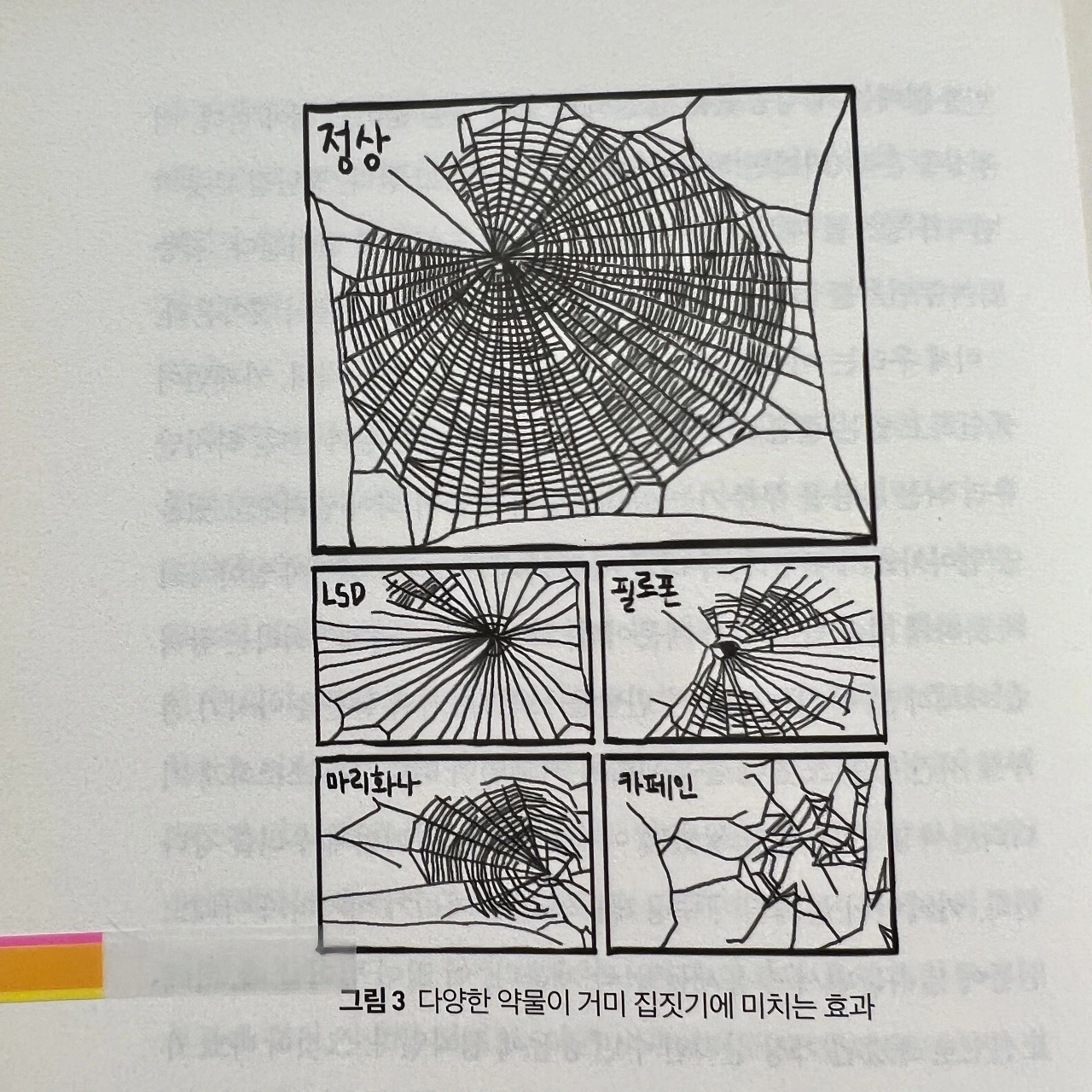 카페인의 효과가 어느 정도인지를 깊이 새길 수 있도록, 1980년대에 미 우주 항공 우주국이 수행한 비밀 연구를 수행하겠다. 해당 연구진은 거미들을 다양한 약물에 노출시킨 뒤, 그들이 짓는 거미집을 관찰했다. 약물에는 LSD, 필로폰, 마리화나, 카페인도 있었다. 그들이 밝힌 연구 결과는 그림 3(위의 그림)에 나와 있다. 연구진은 카페인을 주었을 때 거미가 제 기능을 할 만한 정상적이거나 논리적인 거미집과 비슷한 집을 짓지 못하게 되었다고 했다. 다른 강력한 약물들보다도 더 그랬다.