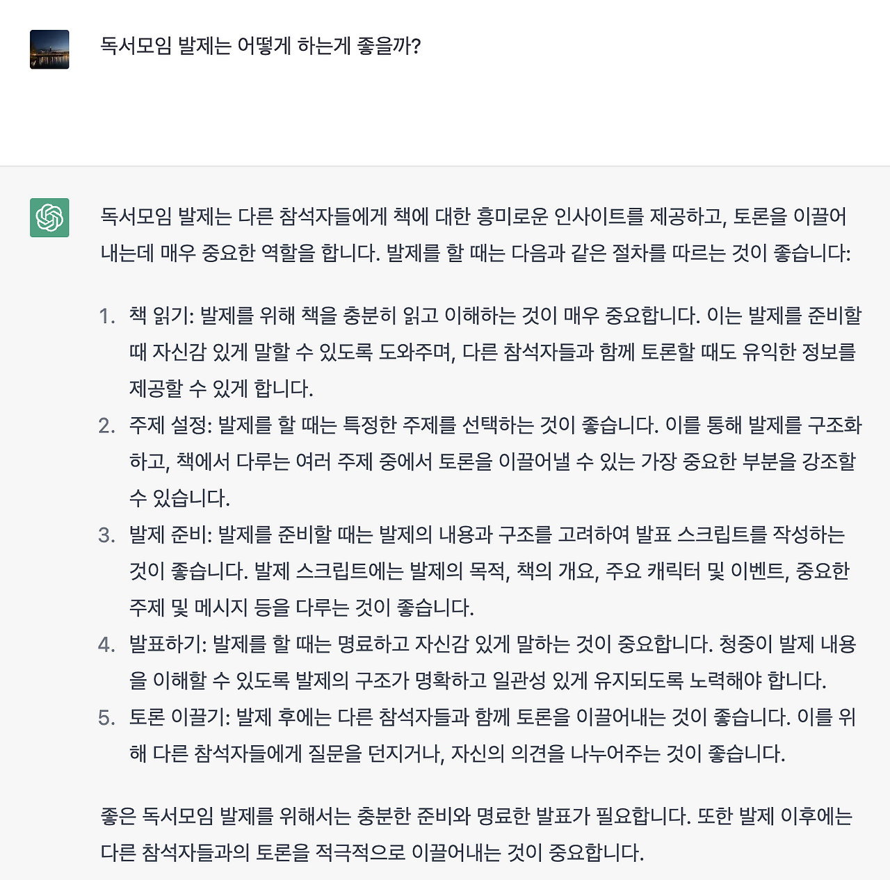독서모임 발제를 준비하면서 ChatGPT를 사용해 봤다. 요즘 인기 많은 인공지능은 독서모임 발제를 어떻게 생각할지 궁금했다. 사람처럼 질문을 만들어낼 수 있을까? 인공지능이 바라보는 책에 대한 관점은 어떨까? 등의 궁금증이 생겼다. 주말 아침 회원가입을 하고 ChatGPT에게 첫 번째 질문을 던졌다.