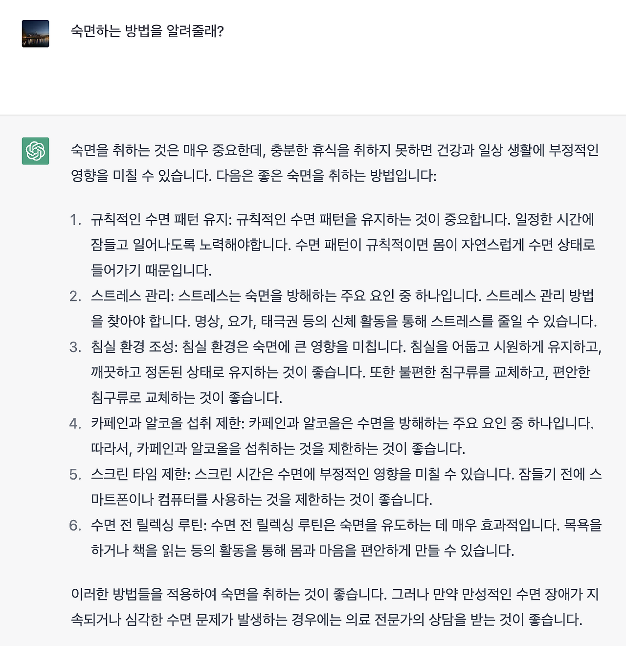 매주 수면에 대한 글을 쓰기 위해 책을 읽는다. 10개의 꼭지를 적기로 마음먹었으니, 오늘 글을 포함해서 2개만 더 적을 계획이다. 수면에 관한 책을 읽다가 문득 ChatGPT는 인간이 숙면하는 방법을 어떻게 정리할까? 궁금해졌다. 친구에게 묻는 것처럼 또 물어본다.