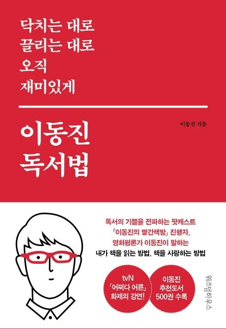 삶에 도움이 되는 실용적인 독서법을 찾기 위해 구체적인 방법을 알려주는 독서법 책도 많이 읽었습니다. 그 과정에서 이동진 작가님의 책을 만났죠. 그 당시 빨간 책방이란 팟캐스트로 유명하셔서 그런지 책 표지가 온통 빨간색이에요. 거기에 자신의 얼굴을 스케치해서 또 자신만의 안경을 매치하는 센스에 놀라며 책을 읽었습니다.