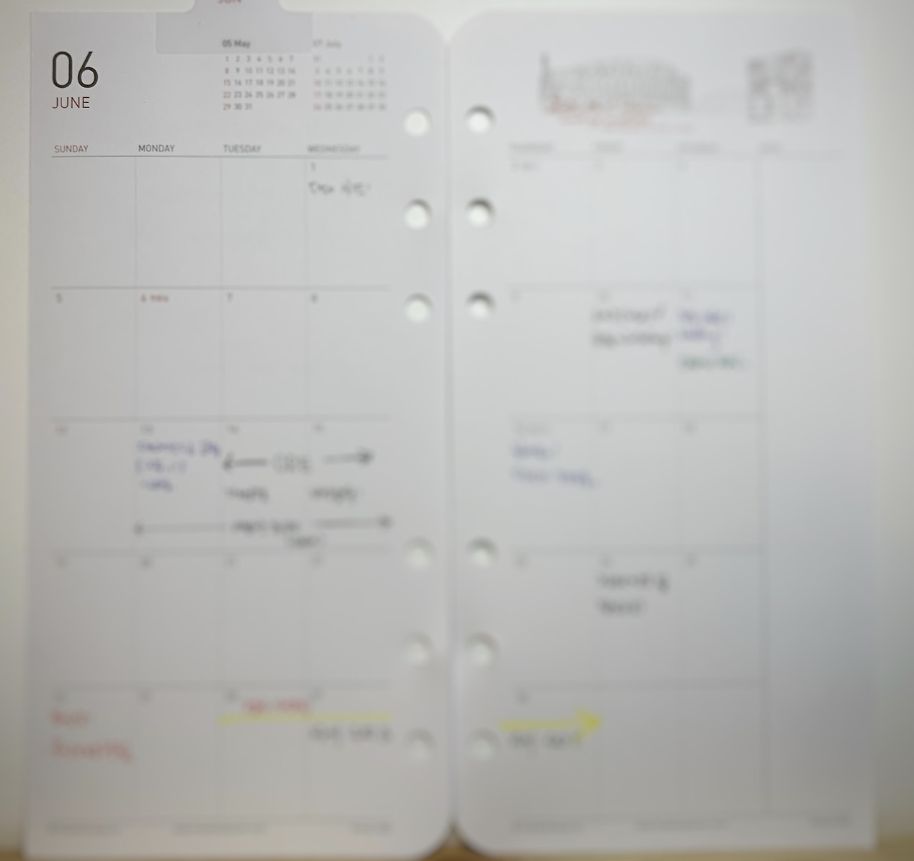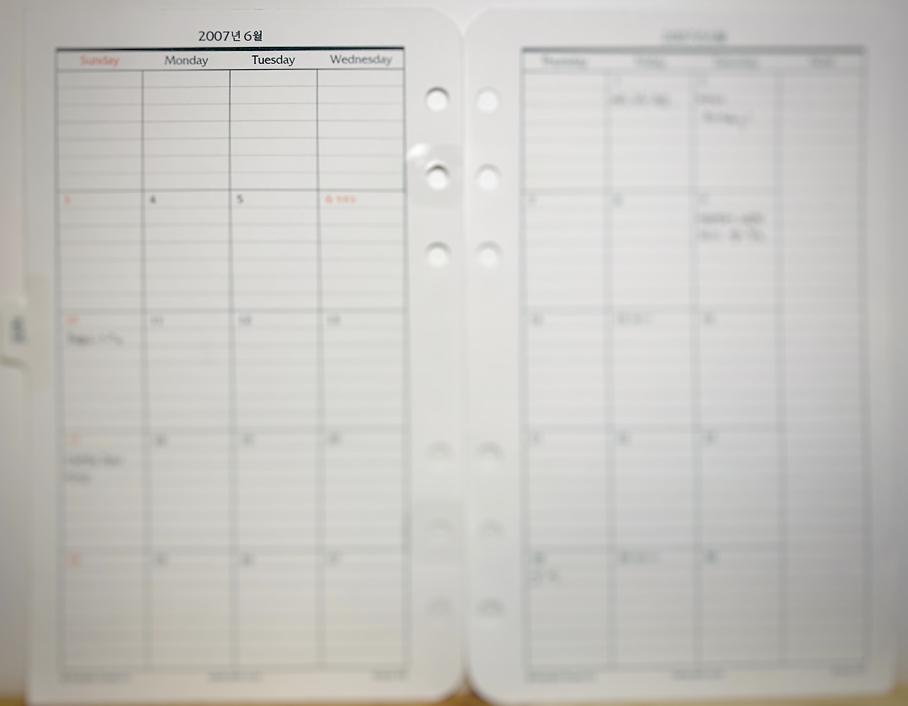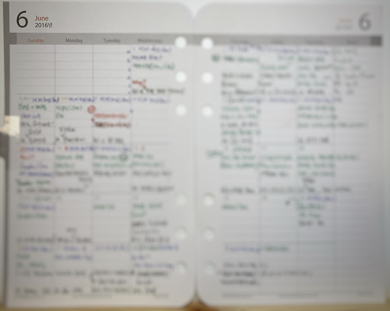처음에 플래너를 쓰기 시작할 때는 비싼 메모장으로 활용했습니다. 프랭클린 플래너를 사는데 최소 5만원에서 최대 20만원 정도 들어갑니다. 처음에는 5만원이 넘는 플래너에 정말 간단한 메모들만 했어요. 혹은 메모를 안 했던 날들도 많네요. 직접 한번 보세요. 제가 초반에 쓰던 플래너의 6월 월간 기록입니다.