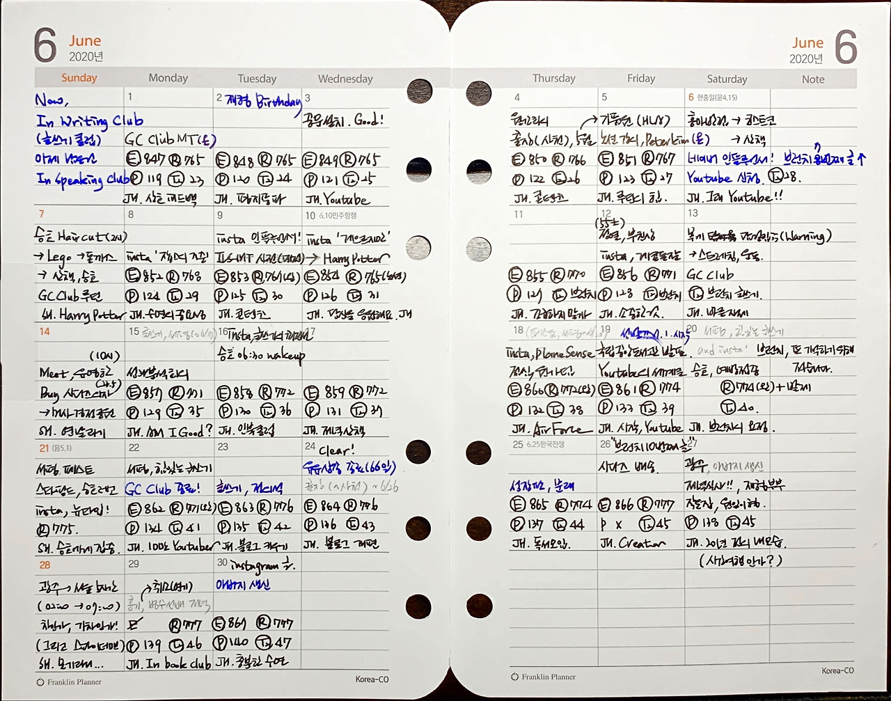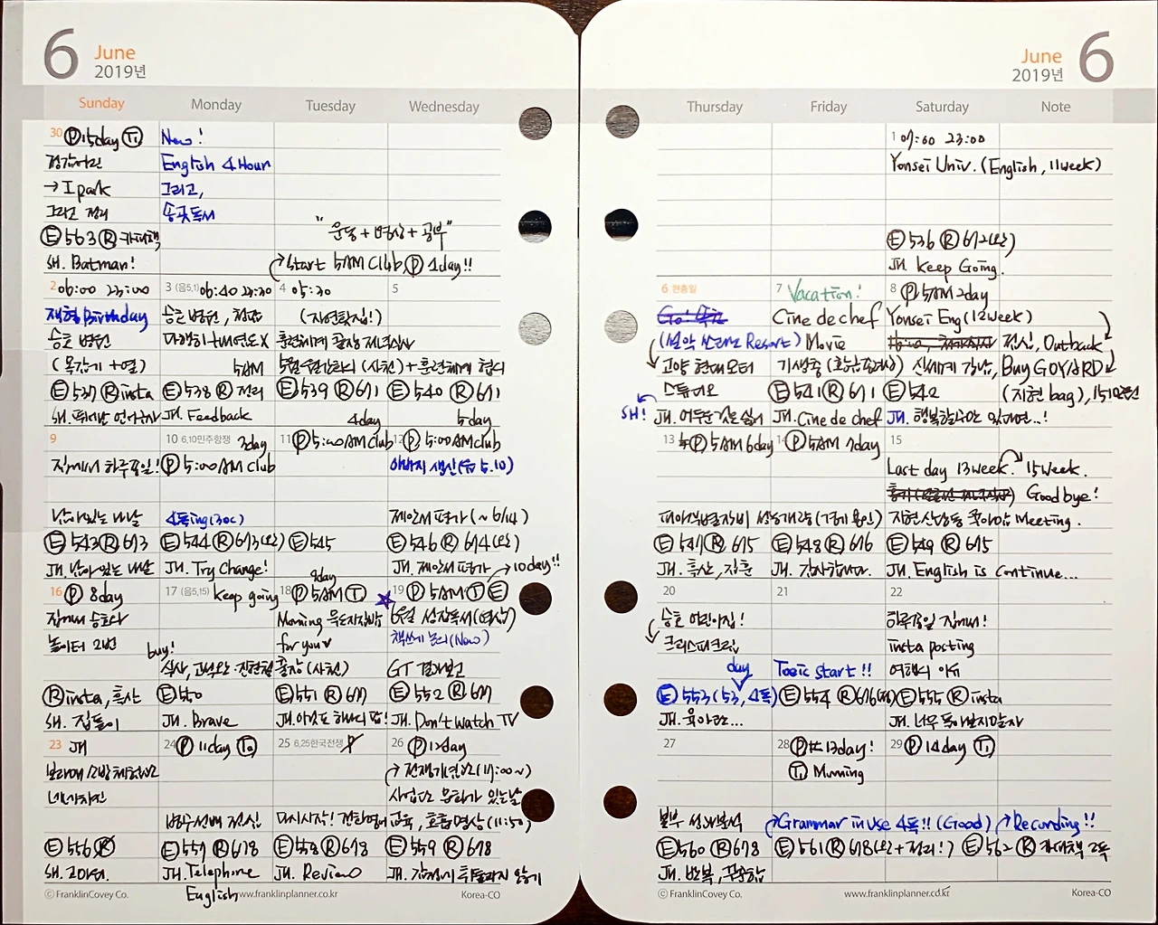 아내와의 약속, 아들의 유치원 행사, 가족행사는 변경될 가능성이 적습니다. 눈에 잘 띄는 파란색 만년필로 꾹꾹 눌러 적으면서 일정을 확정합니다.(저는 플래너를 쓸 때 검은색과 파란색 만년필 그리고 연필을 사용합니다. 만년필은 라미 사파리를 쓰는데 슥삭슥삭 글 쓰는 소리가 좋습니다. 광고는 아닙니다.)