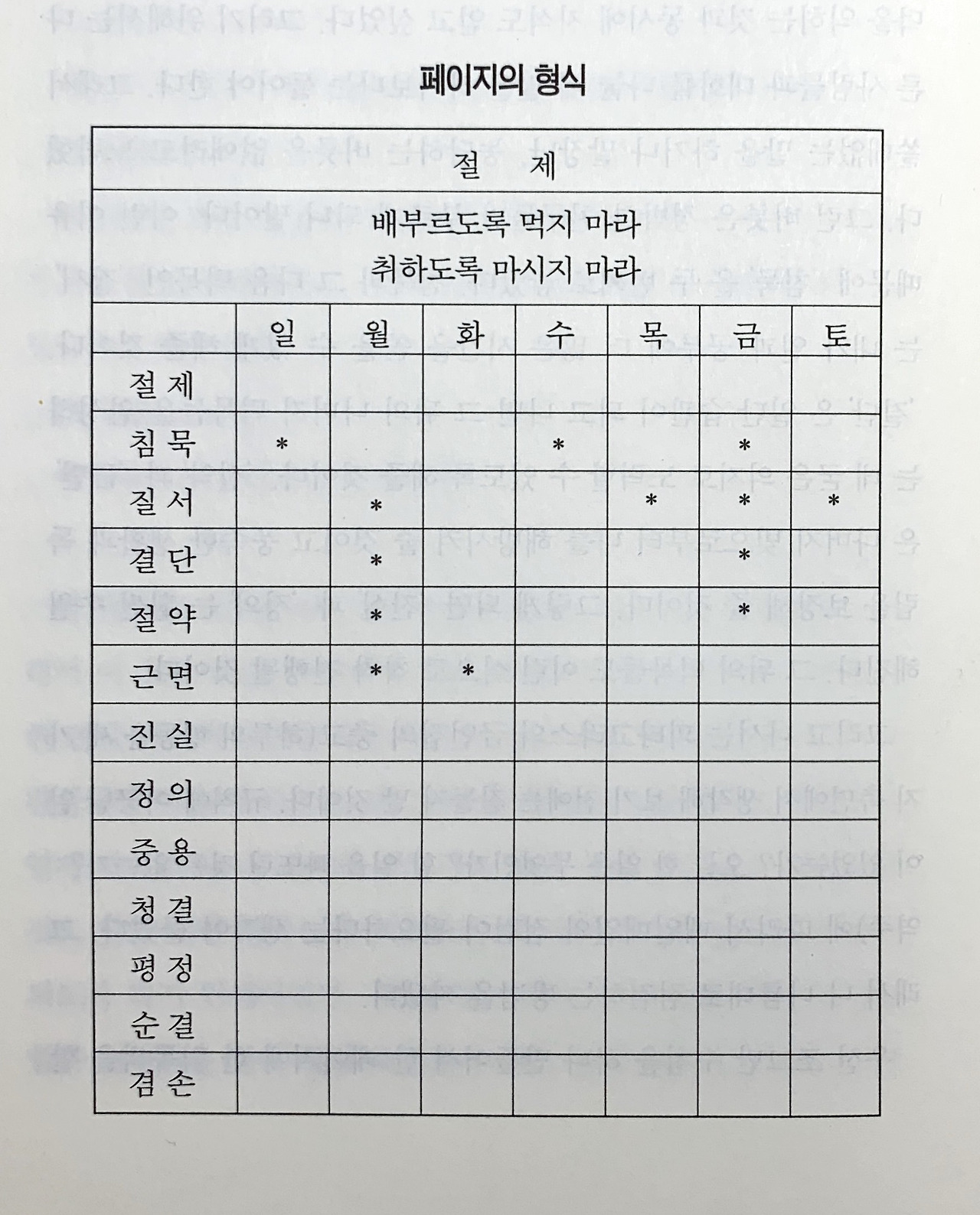 우선 조그만 수첩을 하나 만들어서 한 페이지에 한 덕목씩을 할애했다. 각 페이지마다 빨간 잉크로 가로로 7칸을 만들어서 일주일치를 만들고 요일의 첫 글자로 날짜를 표시했다. 그리고 세로로 13줄을 만들어서 각 줄의 첫 부분에 각 덕분의 첫 글자를 적어 넣었다. 그리고 그날에 행한 덕목을 생각해서 잘못한 일이 있을 때마다 해당 칸에 점을 그려 넣었다.