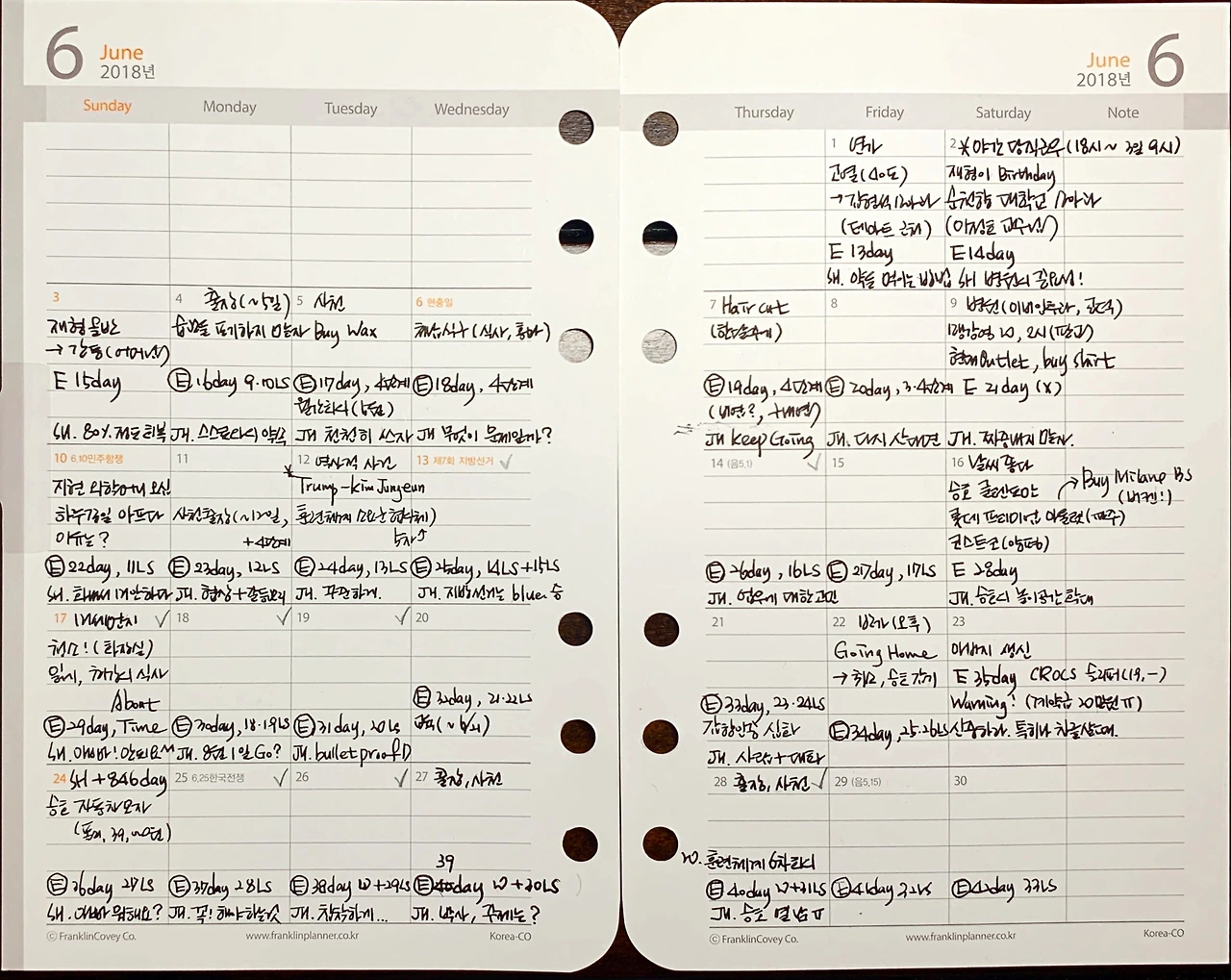 하지만 요즘은 업무용보다 내 삶을 기록하는데 더 많이 활용하고 있습니다. 굳이 숫자로 표현하자면 20퍼센트 정도입니다. 업무와 관련된 내용은 출장 일정이나 중요한 미팅만 적고 있습니다. 가끔 점심식사를 어떤 동료와 했는지도 적어놓습니다. 이것이 생각보다 유용한 이유는 신세를 진 동료에게는 보답을 할 수 있고, 이름 하나를 적어 놓았을 뿐인데 식사를 하면서 했던 이야기들이 함께 생각나는 경우도 있습니다.