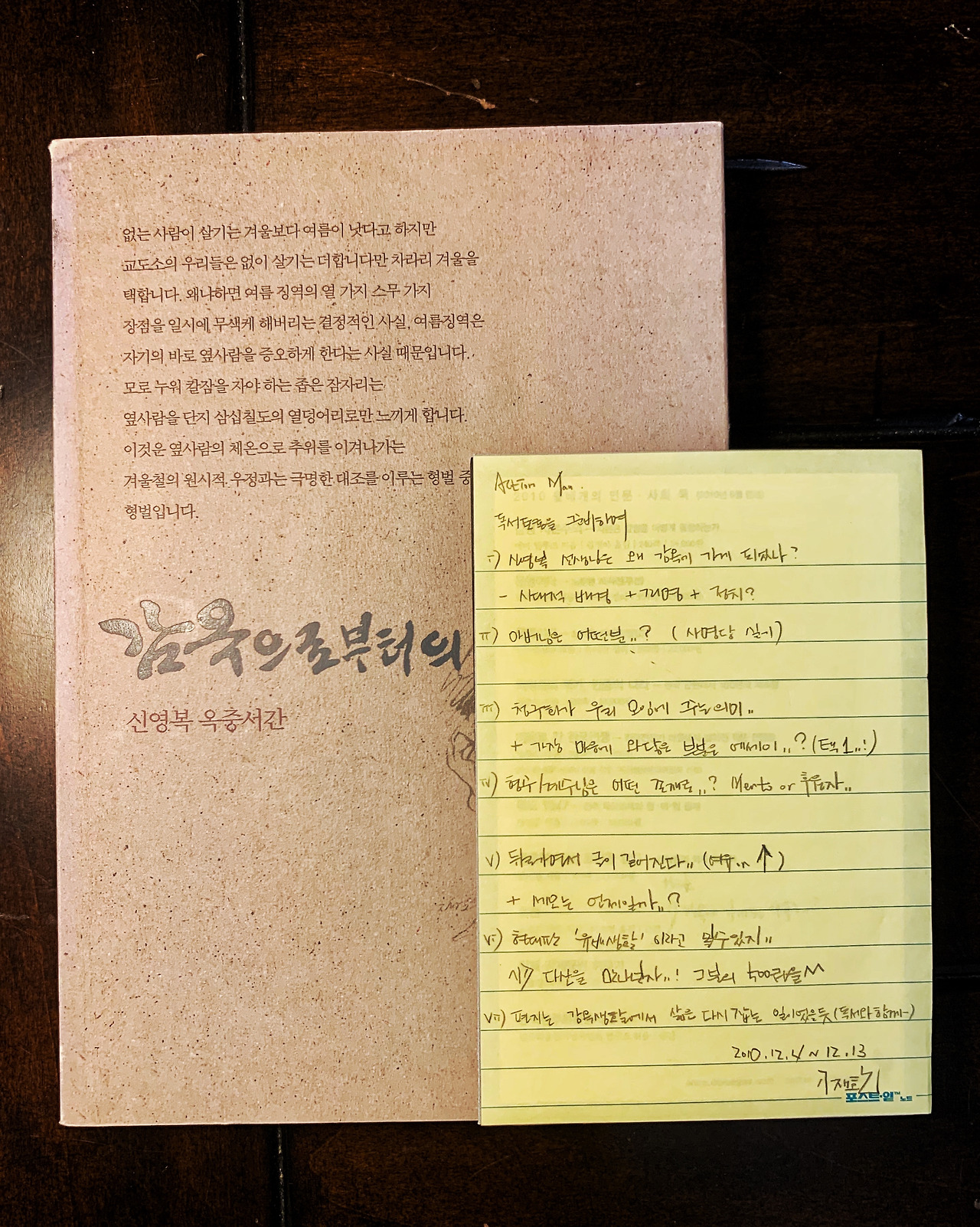 그중에서 첫 번째 독서모임의 책인 <감옥으로부터의 사색>은 아직도 나에게 남다른 의미로 다가온다. 이 책을 왜 첫 번째 책으로 선택했을까? 생각해보면 2010년의 내게 가장 큰 울림을 준 책이었다. 첫 번째 독서모임을 준비하며 적어놓은 메모를 10년 만에 찾았다. 반가운 마음에 같이 올려본다.(앞으로는 책에 독서모임의 후기를 적어서 보관해보자.)