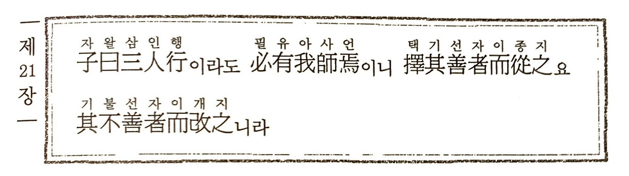 <논어>의 술이편에는 "세 사람이 길을 가더라도 반드시 거기에는 나의 스승이 있으니, 그 선한 것은 찾아서 따르고 그 선하지 않은 것은 고친다."라는 말이 있다. 스승은 도처에 있고 나의 인격을 향상하는 데 도움이 되면 모두 스승이라는 말이다.
