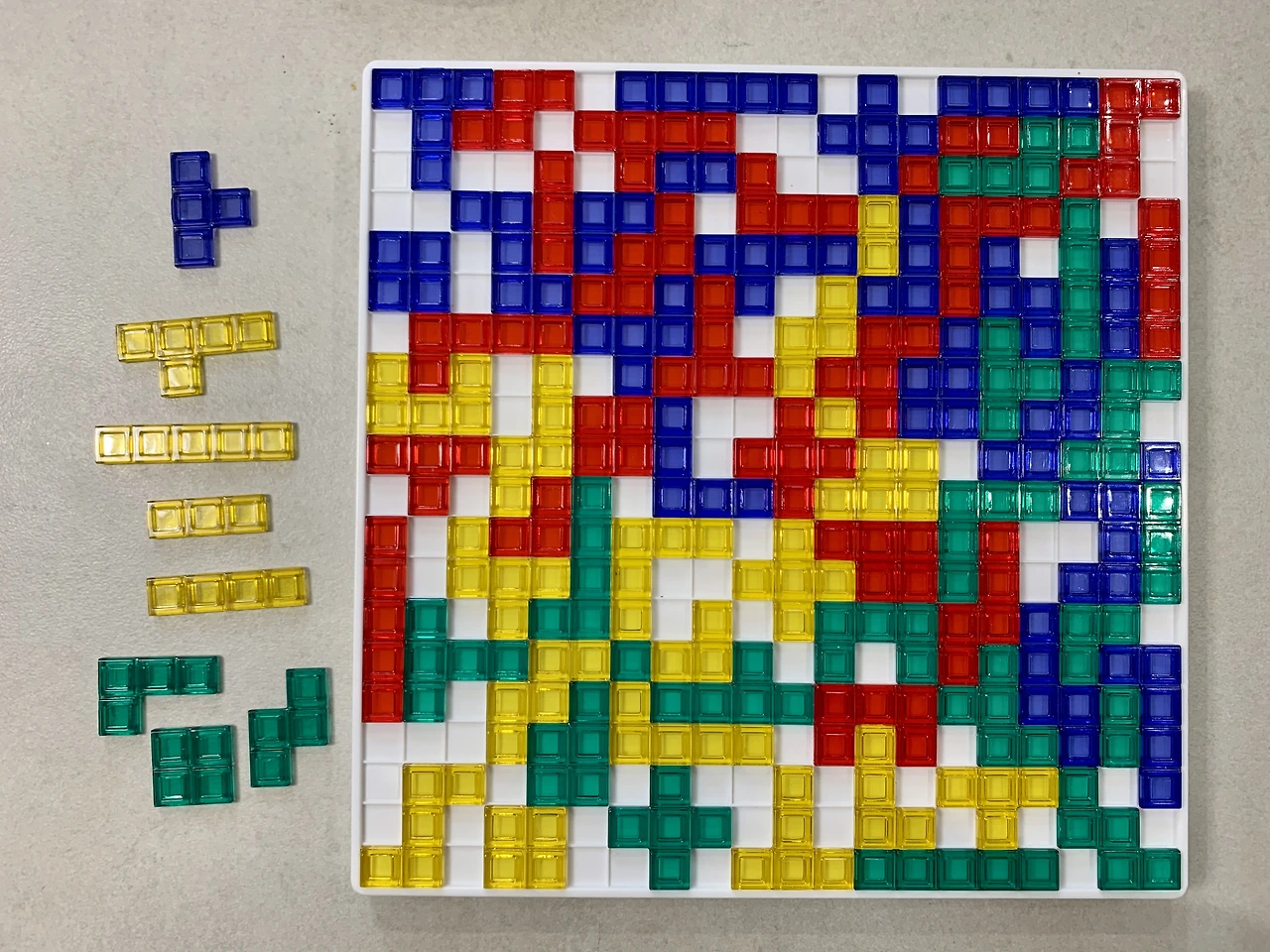 4가지 색의 폴리오미노(모노 미노, 도미노, 테트로미노, 펜토미노) 1~5개의 정사각형을 조합하여 만들 수 있는 모든 모양(21종류)이 주어진다.