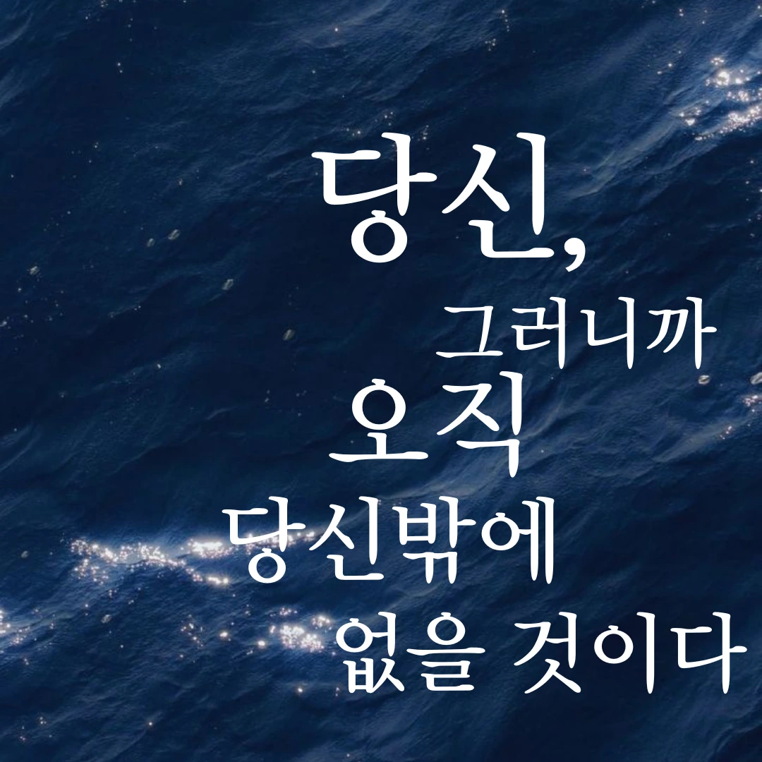 내가 본 마지막 세상은 당신이어서 누군가 내게 세상에 대해 물어온다면 대답할 수 있는 건 오직 당신 이름 밖에 없을 것이고 당신의 모습밖에 없을 것이며 당신의 향기 당신의 목소리 당신, 그러니까 오직 당신밖에 없을 것이다.