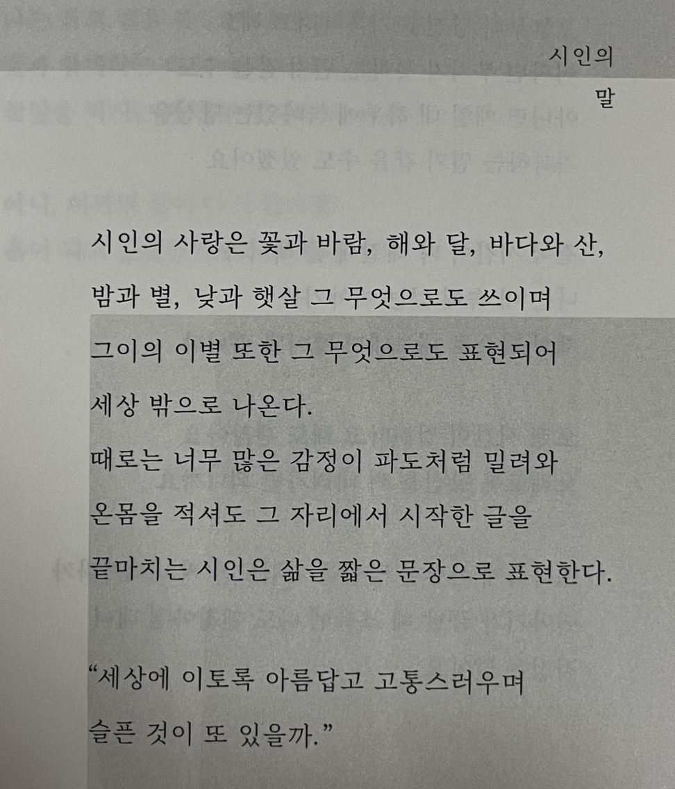 ”세상에 이토록 아름답고 고통스러우며 슬픈 것이 또 있을까.“ 라고 쓴 시인의 말 마지막 구절 있잖아