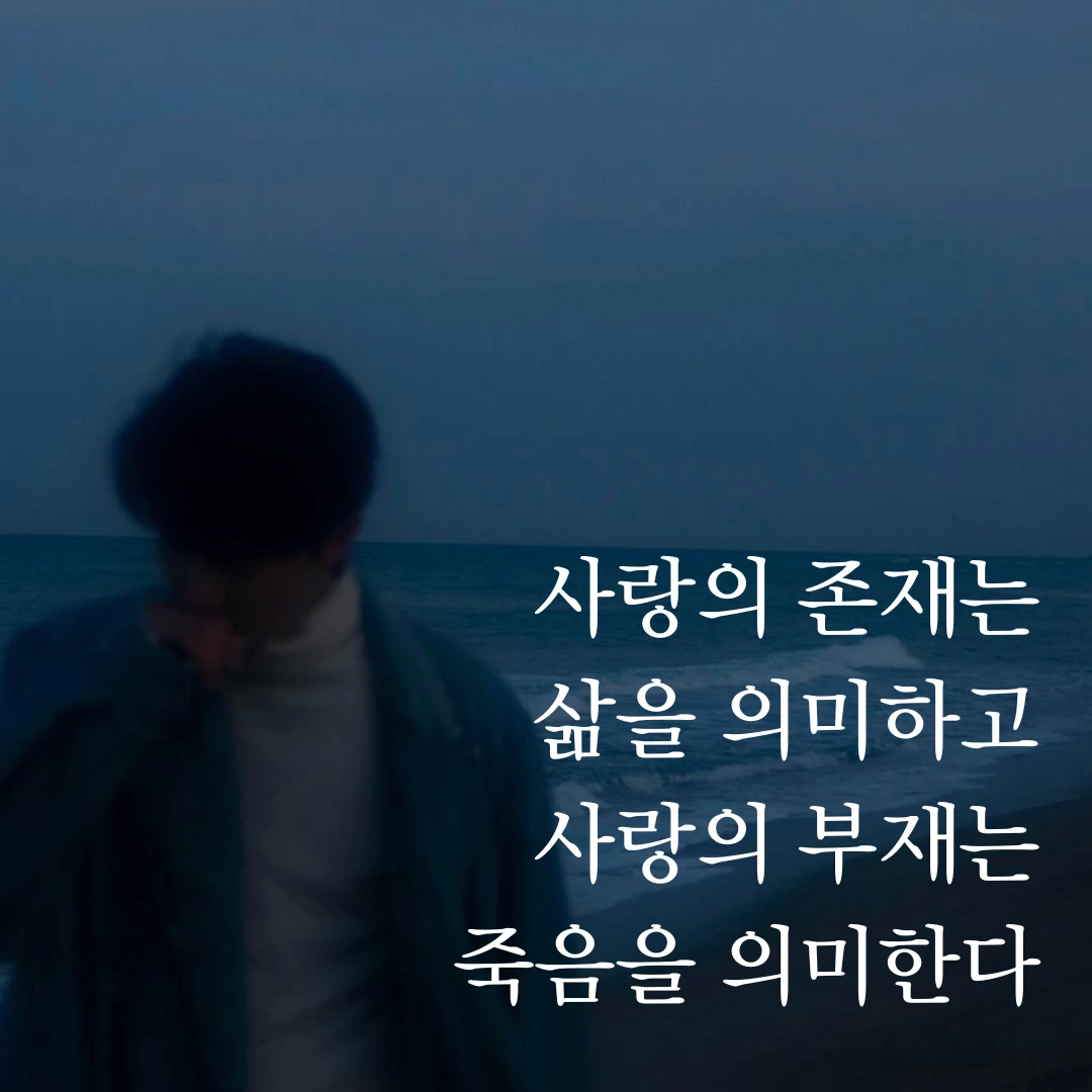 사람은 살아가며 여러 번 죽음을 예습합니다. 그중 우리가 가장 쉽게 죽음을 예습하는 방법이 바로 사랑을 하는 것이죠. 사랑은 삶과 죽음이 공존한다고 할 수 있습니다. 그러니까 사랑의 존재는 삶을 의미하고 사랑의 부재는 죽음을 의미한다는 말입니다. 그렇게 살아가는 동안 셀 수 없는 죽음 예습을 하고 본인 세계의 종말을 맞이합니다.