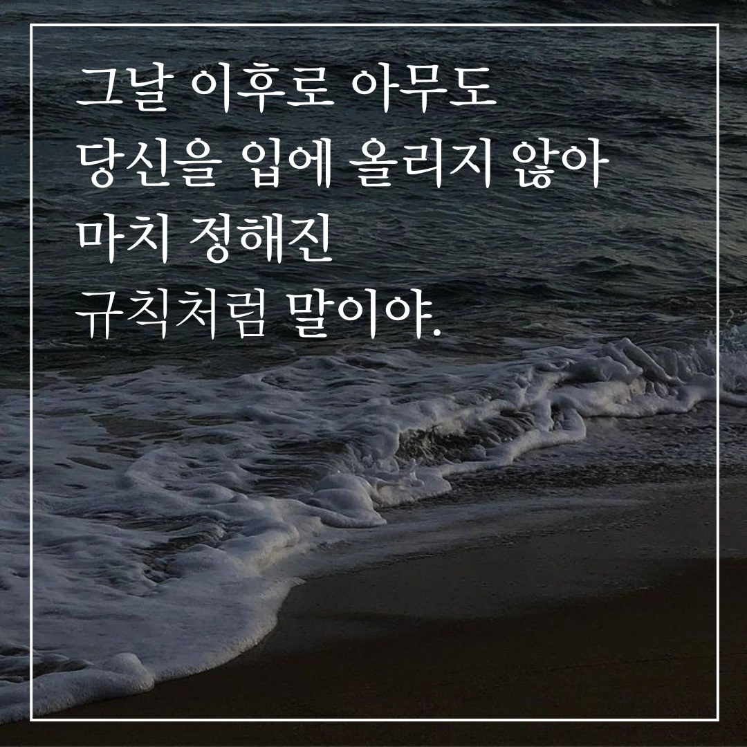 깨어나서 한참이나 울었지 뭐야, 내 눈물은 여전히 마르지가 않아 그리고 여전히 당신에게만 반응해, 있잖아 세상은 잘 돌아가고 있어 당신이 없어도 시간은 흘러가고 사람들은 텅 빈 눈을 하고서도 일상생활을 멈추지 않아 그리고 이따금 찾아오는 당신 빈자리의 공허와 당신을 잃은 상실감으로 그들도 나도 숨어서 눈물을 흘리곤 해. 다들 그래 괜찮은 척 살아가지만, 사실은 하나도 괜찮지 않거든, 그날 이후로 아무도 당신을 입에 올리지 않아 마치 정해진 규칙처럼 말이야.