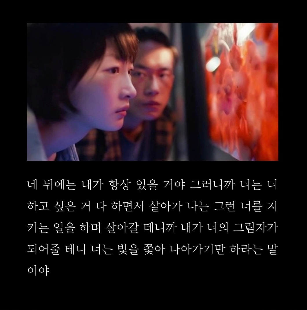 네 뒤에는 내가 항상 있을 거야 그러니까 너는 너 하고 싶은 거 다 하면서 살아가 나는 그런 너를 지키는 일을 하며 살아갈 테니까 내가 너의 그림자가 되어줄 테니 너는 빛을 쫓아 나아가기만 하라는 말이야