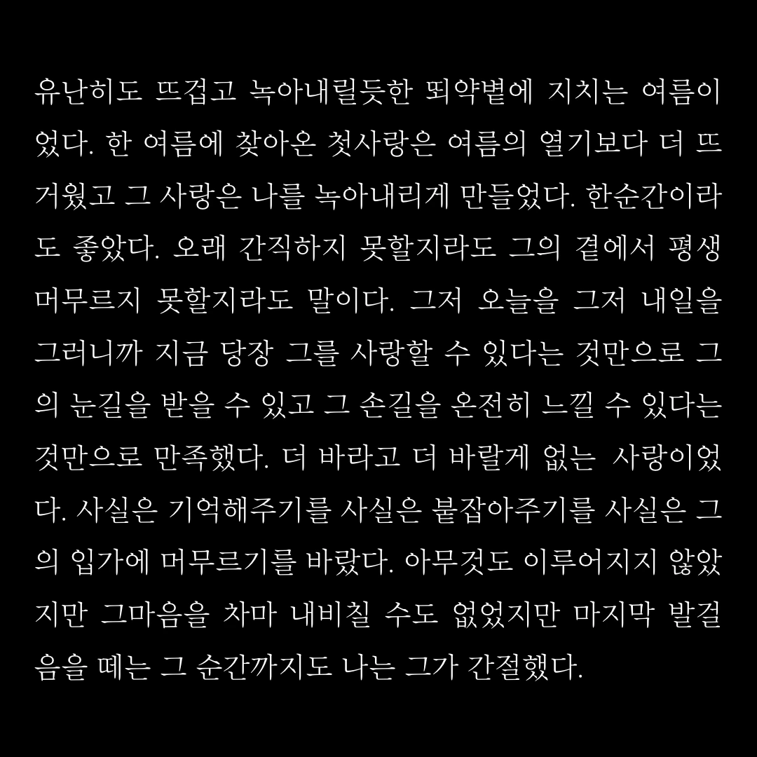 유난히도 뜨겁고 녹아내릴듯한 뙤약볕에 지치는 여름이었다. 한 여름에 찾아온 첫사랑은 여름의 열기보다 더 뜨거웠고 그 사랑은 나를 녹아내리게 만들었다. 한순간이라도 좋았다. 오래 간직하지 못할지라도 그의 곁에서 평생 머무르지 못할지라도 말이다. 그저 오늘을 그저 내일을 그러니까 지금 당장 그를 사랑할 수 있다는 것만으로 그의 눈길을 받을 수 있고 그 손길을 온전히 느낄 수 있다는 것만으로 만족했다. 더 바라고 더 바랄게 없는 사랑이었다. 사실은 기억해주기를 사실은 붙잡아주기를 사실은 그의 입가에 머무르기를 바랐다. 아무것도 이루어지지 않았지만 그마음을 차마 내비칠 수도 없었지만 마지막 발걸음을 떼는 그 순간까지도 나는 그가 간절했다.