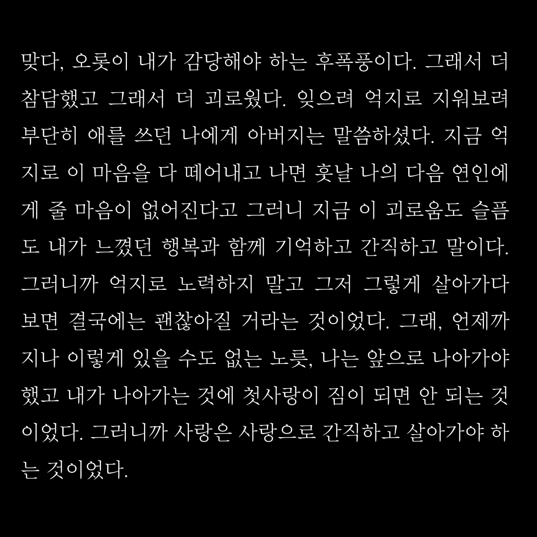 맞다, 오롯이 내가 감당해야 하는 후폭풍이다. 그래서 더 참담했고 그래서 더 괴로웠다. 잊으려 억지로 지워보려 부단히 애를 쓰던 나에게 아버지는 말씀하셨다. 지금 억지로 이 마음을 다 떼어내고 나면 훗날 나의 다음 연인에게 줄 마음이 없어진다고 그러니 지금 이 괴로움도 슬픔도 내가 느꼈던 행복과 함께 기억하고 간직하고 말이다. 그러니까 억지로 노력하지 말고 그저 그렇게 살아가다보면 결국에는 괜찮아질거라는 것이었다. 그래, 언제까지나 이렇게 있을 수도 없는 노릇, 나는 앞으로 나아가야했고 내가 나아가는것에 첫사랑이 짐이 되면 안 되는 것이었다. 그러니까 사랑은 사랑으로 간직하고 살아가야 하는 것이었다.